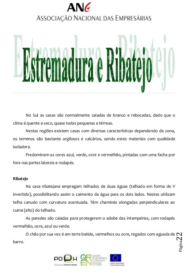 22. 22. Página22 No Sul as casas são normalmente caiadas de branco e rebocadas, dado que o clima é quente e seco, quase todas pequenas e térreas. Nestas regiões existem casas com diversas características dependendo da zona, os terrenos são bastante argilosos e calcários, sendo estes materiais com qualidade isoladora. Predominam as cores azul, verde, ocre e vermelhão, pintadas com uma facha por fora nas partes laterais e rodapés. Ribatejo Na casa ribatejana empregam telhados de duas águas (telhado em forma de V invertido), possibilitando assim o caimento da água para os dois lados. Nestes utilizam telha canudo com curvatura acentuada. Têm chaminés alongadas perpendiculares ao cume (alto) do telhado. As paredes são caiadas para protegerem o adobe das intempéries, com rodapés vermelhão, ocre, azul ou verde. O chão por sua vez é em terra batida, vermelhos ou ocre, regados com aguada de barro.