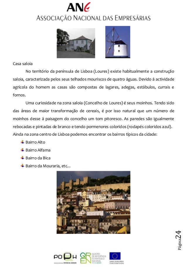 24. 24. Página24 Casa saloia No território da península de Lisboa (Loures) existe habitualmente a construção saloia, caracterizada pelos seus telhados mouriscos de quatro águas. Devido á actividade agrícola do homem as casas são compostas de lagares, adegas, estábulos, currais e fornos. Uma curiosidade na zona saloia (Concelho de Loures) é seus moinhos. Tendo sido das áreas de maior transformação de cereais, é por isso natural que um número de moinhos desse á paisagem do concelho um tom pitoresco. As paredes são igualmente rebocadas e pintadas de branco e tendo pormenores coloridos (rodapés coloridos azul). Ainda na zona centro de Lisboa podemos encontrar os bairros típicos da cidade: Bairro Alto Bairro Alfama Bairro da Bica Bairro da Mouraria, etc...