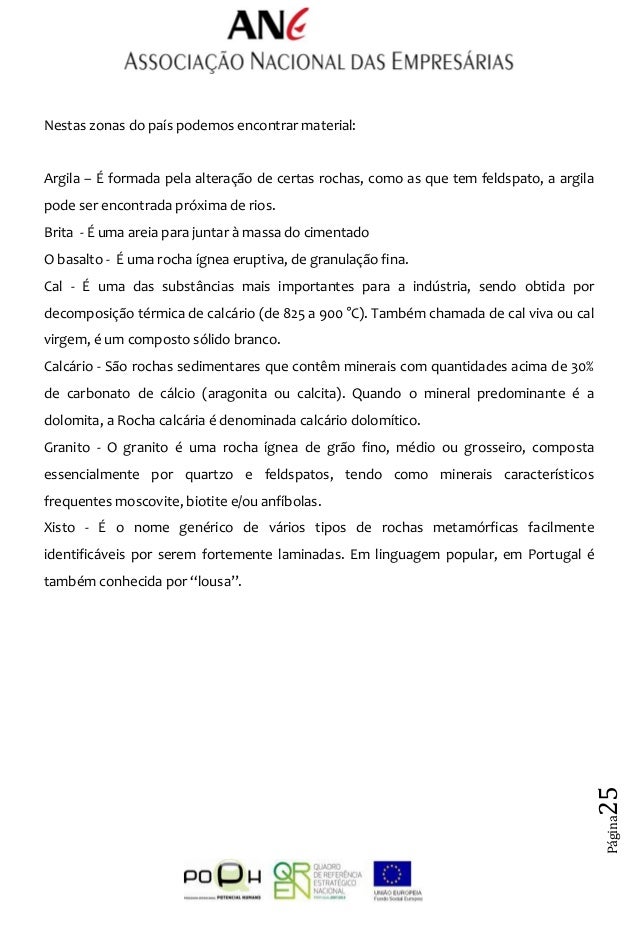 25. 25. Página25 Nestas zonas do país podemos encontrar material: Argila – É formada pela alteração de certas rochas, como as que tem feldspato, a argila pode ser encontrada próxima de rios. Brita - É uma areia para juntar à massa do cimentado O basalto - É uma rocha ígnea eruptiva, de granulação fina. Cal - É uma das substâncias mais importantes para a indústria, sendo obtida por decomposição térmica de calcário (de 825 a 900 °C). Também chamada de cal viva ou cal virgem, é um composto sólido branco. Calcário - São rochas sedimentares que contêm minerais com quantidades acima de 30% de carbonato de cálcio (aragonita ou calcita). Quando o mineral predominante é a dolomita, a Rocha calcária é denominada calcário dolomítico. Granito - O granito é uma rocha ígnea de grão fino, médio ou grosseiro, composta essencialmente por quartzo e feldspatos, tendo como minerais característicos frequentes moscovite, biotite e/ou anfíbolas. Xisto - É o nome genérico de vários tipos de rochas metamórficas facilmente identificáveis por serem fortemente laminadas. Em linguagem popular, em Portugal é também conhecida por “lousa”.