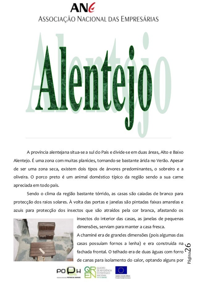 26. 26. Página26 A província alentejana situa-se a sul do País e divide-se em duas áreas, Alto e Baixo Alentejo. É uma zona com muitas planícies, tornando-se bastante árida no Verão. Apesar de ser uma zona seca, existem dois tipos de árvores predominantes, o sobreiro e a oliveira. O porco preto é um animal doméstico típico da região sendo a sua carne apreciada em todo país. Sendo o clima da região bastante tórrido, as casas são caiadas de branco para protecção dos raios solares. À volta das portas e janelas são pintadas faixas amarelas e azuis para protecção dos insectos que são atraídos pela cor branca, afastando os insectos do interior das casas, as janelas de pequenas dimensões, serviam para manter a casa fresca. A chaminé era de grandes dimensões (pois algumas das casas possuíam fornos a lenha) e era construída na fachada frontal. O telhado era de duas águas com forro de canas para isolamento do calor, optando alguns por