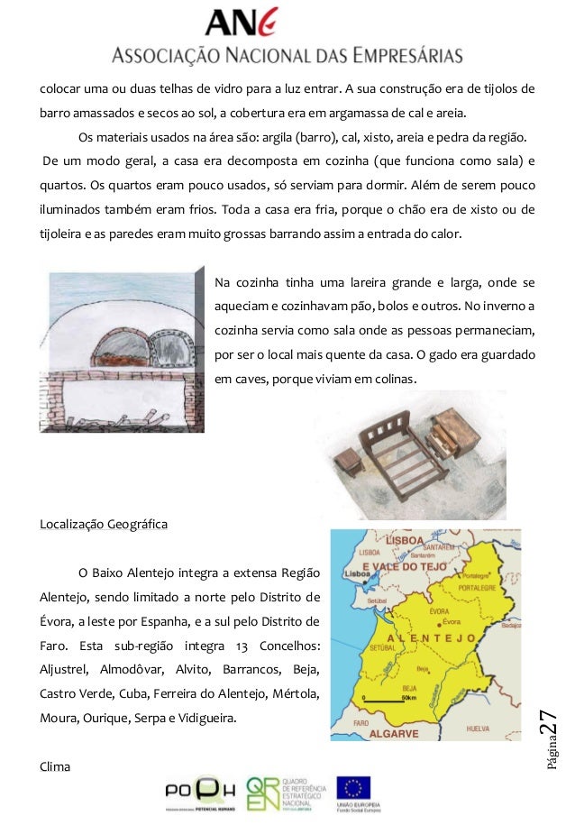 27. 27. Página27 colocar uma ou duas telhas de vidro para a luz entrar. A sua construção era de tijolos de barro amassados e secos ao sol, a cobertura era em argamassa de cal e areia. Os materiais usados na área são: argila (barro), cal, xisto, areia e pedra da região. De um modo geral, a casa era decomposta em cozinha (que funciona como sala) e quartos. Os quartos eram pouco usados, só serviam para dormir. Além de serem pouco iluminados também eram frios. Toda a casa era fria, porque o chão era de xisto ou de tijoleira e as paredes eram muito grossas barrando assim a entrada do calor. Na cozinha tinha uma lareira grande e larga, onde se aqueciam e cozinhavam pão, bolos e outros. No inverno a cozinha servia como sala onde as pessoas permaneciam, por ser o local mais quente da casa. O gado era guardado em caves, porque viviam em colinas. Localização Geográfica O Baixo Alentejo integra a extensa Região Alentejo, sendo limitado a norte pelo Distrito de Évora, a leste por Espanha, e a sul pelo Distrito de Faro. Esta sub-região integra 13 Concelhos: Aljustrel, Almodôvar, Alvito, Barrancos, Beja, Castro Verde, Cuba, Ferreira do Alentejo, Mértola, Moura, Ourique, Serpa e Vidigueira. Clima