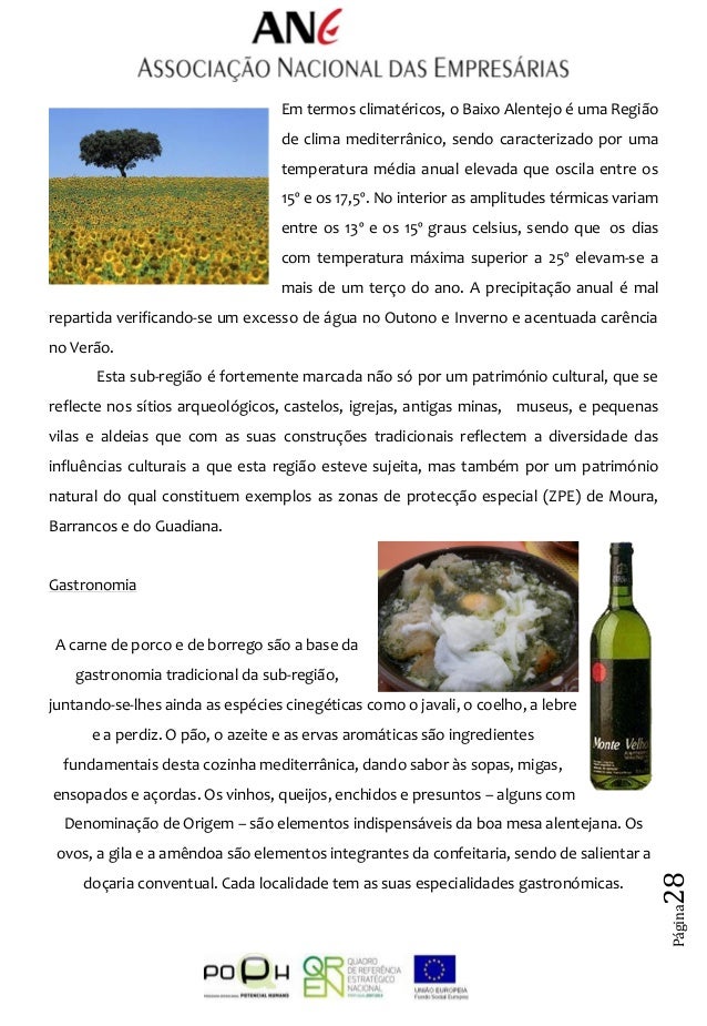 28. 28. Página28 Em termos climatéricos, o Baixo Alentejo é uma Região de clima mediterrânico, sendo caracterizado por uma temperatura média anual elevada que oscila entre os 15º e os 17,5º. No interior as amplitudes térmicas variam entre os 13º e os 15º graus celsius, sendo que os dias com temperatura máxima superior a 25º elevam-se a mais de um terço do ano. A precipitação anual é mal repartida verificando-se um excesso de água no Outono e Inverno e acentuada carência no Verão. Esta sub-região é fortemente marcada não só por um património cultural, que se reflecte nos sítios arqueológicos, castelos, igrejas, antigas minas, museus, e pequenas vilas e aldeias que com as suas construções tradicionais reflectem a diversidade das influências culturais a que esta região esteve sujeita, mas também por um património natural do qual constituem exemplos as zonas de protecção especial (ZPE) de Moura, Barrancos e do Guadiana. Gastronomia A carne de porco e de borrego são a base da gastronomia tradicional da sub-região, juntando-se-lhes ainda as espécies cinegéticas como o javali, o coelho, a lebre e a perdiz. O pão, o azeite e as ervas aromáticas são ingredientes fundamentais desta cozinha mediterrânica, dando sabor às sopas, migas, ensopados e açordas. Os vinhos, queijos, enchidos e presuntos – alguns com Denominação de Origem – são elementos indispensáveis da boa mesa alentejana. Os ovos, a gila e a amêndoa são elementos integrantes da confeitaria, sendo de salientar a doçaria conventual. Cada localidade tem as suas especialidades gastronómicas.