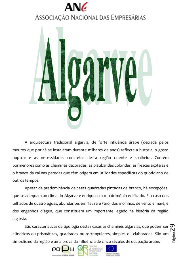 29. 29. Página29 A arquitectura tradicional algarvia, de forte influência árabe (deixada pelos mouros que por cá se instalaram durante milhares de anos) reflecte a história, o gosto popular e as necessidades concretas desta região quente e soalheira. Contém pormenores como as chaminés decoradas, as platibandas coloridas, as frescas açoteias e o branco da cal nas paredes que têm origem em utilidades específicas do quotidiano de outros tempos. Apesar da predominância de casas quadradas pintadas de branco, há excepções, que se adequam ao clima do Algarve e enriquecem o património edificado. É o caso dos telhados de quatro águas, abundantes em Tavira e Faro, dos moinhos, de vento e maré, e dos engenhos d’água, que constituem um importante legado na história da região algarvia. São características da tipologia destas casas as chaminés algarvias, que podem ser cilíndricas ou prismáticas, quadradas ou rectangulares, simples ou elaboradas. São um simbolismo da região e uma prova da influência de cinco séculos de ocupação árabe.