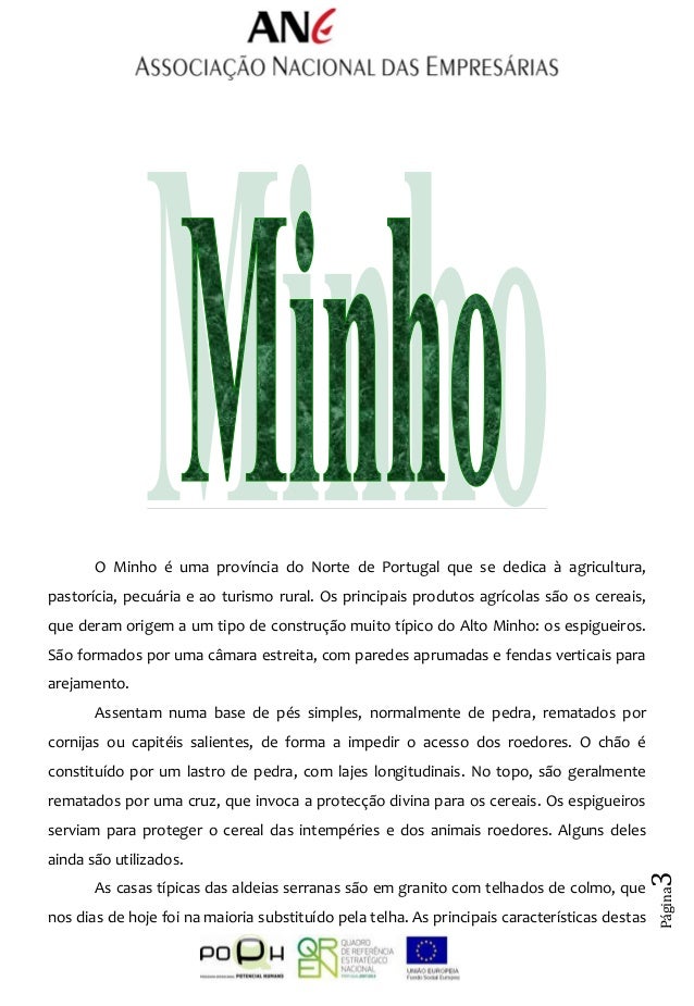 3. 3. Página3 O Minho é uma província do Norte de Portugal que se dedica à agricultura, pastorícia, pecuária e ao turismo rural. Os principais produtos agrícolas são os cereais, que deram origem a um tipo de construção muito típico do Alto Minho: os espigueiros. São formados por uma câmara estreita, com paredes aprumadas e fendas verticais para arejamento. Assentam numa base de pés simples, normalmente de pedra, rematados por cornijas ou capitéis salientes, de forma a impedir o acesso dos roedores. O chão é constituído por um lastro de pedra, com lajes longitudinais. No topo, são geralmente rematados por uma cruz, que invoca a protecção divina para os cereais. Os espigueiros serviam para proteger o cereal das intempéries e dos animais roedores. Alguns deles ainda são utilizados. As casas típicas das aldeias serranas são em granito com telhados de colmo, que nos dias de hoje foi na maioria substituído pela telha. As principais características destas