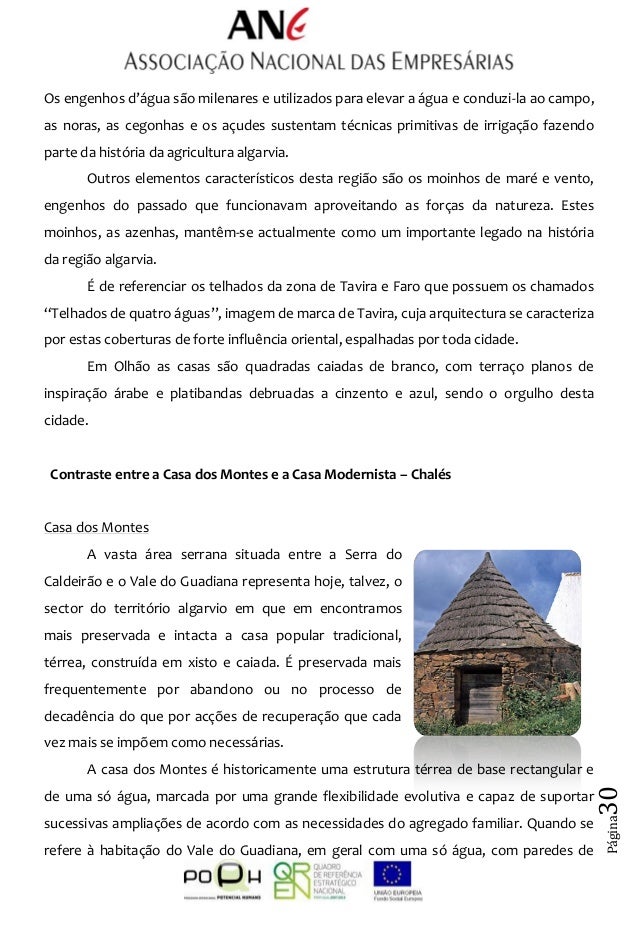 30. 30. Página30 Os engenhos d’água são milenares e utilizados para elevar a água e conduzi-la ao campo, as noras, as cegonhas e os açudes sustentam técnicas primitivas de irrigação fazendo parte da história da agricultura algarvia. Outros elementos característicos desta região são os moinhos de maré e vento, engenhos do passado que funcionavam aproveitando as forças da natureza. Estes moinhos, as azenhas, mantêm-se actualmente como um importante legado na história da região algarvia. É de referenciar os telhados da zona de Tavira e Faro que possuem os chamados “Telhados de quatro águas”, imagem de marca de Tavira, cuja arquitectura se caracteriza por estas coberturas de forte influência oriental, espalhadas por toda cidade. Em Olhão as casas são quadradas caiadas de branco, com terraço planos de inspiração árabe e platibandas debruadas a cinzento e azul, sendo o orgulho desta cidade. Contraste entre a Casa dos Montes e a Casa Modernista – Chalés Casa dos Montes A vasta área serrana situada entre a Serra do Caldeirão e o Vale do Guadiana representa hoje, talvez, o sector do território algarvio em que em encontramos mais preservada e intacta a casa popular tradicional, térrea, construída em xisto e caiada. É preservada mais frequentemente por abandono ou no processo de decadência do que por acções de recuperação que cada vez mais se impõem como necessárias. A casa dos Montes é historicamente uma estrutura térrea de base rectangular e de uma só água, marcada por uma grande flexibilidade evolutiva e capaz de suportar sucessivas ampliações de acordo com as necessidades do agregado familiar. Quando se refere à habitação do Vale do Guadiana, em geral com uma só água, com paredes de