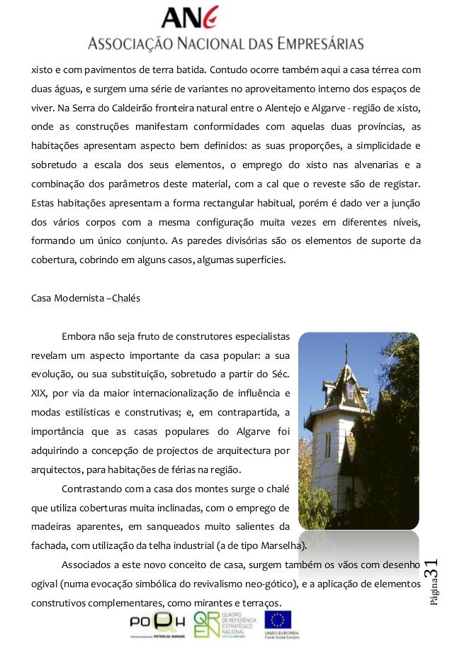 31. 31. Página31 xisto e com pavimentos de terra batida. Contudo ocorre também aqui a casa térrea com duas águas, e surgem uma série de variantes no aproveitamento interno dos espaços de viver. Na Serra do Caldeirão fronteira natural entre o Alentejo e Algarve - região de xisto, onde as construções manifestam conformidades com aquelas duas províncias, as habitações apresentam aspecto bem definidos: as suas proporções, a simplicidade e sobretudo a escala dos seus elementos, o emprego do xisto nas alvenarias e a combinação dos parâmetros deste material, com a cal que o reveste são de registar. Estas habitações apresentam a forma rectangular habitual, porém é dado ver a junção dos vários corpos com a mesma configuração muita vezes em diferentes níveis, formando um único conjunto. As paredes divisórias são os elementos de suporte da cobertura, cobrindo em alguns casos, algumas superfícies. Casa Modernista –Chalés Embora não seja fruto de construtores especialistas revelam um aspecto importante da casa popular: a sua evolução, ou sua substituição, sobretudo a partir do Séc. XIX, por via da maior internacionalização de influência e modas estilísticas e construtivas; e, em contrapartida, a importância que as casas populares do Algarve foi adquirindo a concepção de projectos de arquitectura por arquitectos, para habitações de férias na região. Contrastando com a casa dos montes surge o chalé que utiliza coberturas muita inclinadas, com o emprego de madeiras aparentes, em sanqueados muito salientes da fachada, com utilização da telha industrial (a de tipo Marselha). Associados a este novo conceito de casa, surgem também os vãos com desenho ogival (numa evocação simbólica do revivalismo neo-gótico), e a aplicação de elementos construtivos complementares, como mirantes e terraços.