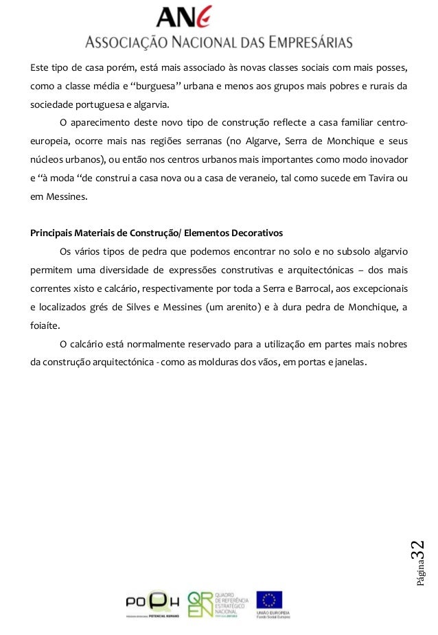32. 32. Página32 Este tipo de casa porém, está mais associado às novas classes sociais com mais posses, como a classe média e “burguesa” urbana e menos aos grupos mais pobres e rurais da sociedade portuguesa e algarvia. O aparecimento deste novo tipo de construção reflecte a casa familiar centro- europeia, ocorre mais nas regiões serranas (no Algarve, Serra de Monchique e seus núcleos urbanos), ou então nos centros urbanos mais importantes como modo inovador e “à moda “de construi a casa nova ou a casa de veraneio, tal como sucede em Tavira ou em Messines. Principais Materiais de Construção/ Elementos Decorativos Os vários tipos de pedra que podemos encontrar no solo e no subsolo algarvio permitem uma diversidade de expressões construtivas e arquitectónicas – dos mais correntes xisto e calcário, respectivamente por toda a Serra e Barrocal, aos excepcionais e localizados grés de Silves e Messines (um arenito) e à dura pedra de Monchique, a foiaíte. O calcário está normalmente reservado para a utilização em partes mais nobres da construção arquitectónica - como as molduras dos vãos, em portas e janelas.