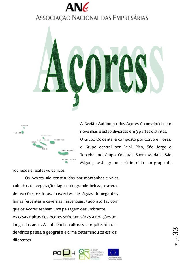 33. 33. Página33 A Região Autónoma dos Açores é constituída por nove ilhas e estão divididas em 3 partes distintas. O Grupo Ocidental é composto por Corvo e Flores; o Grupo central por Faial, Pico, São Jorge e Terceira; no Grupo Oriental, Santa Maria e São Miguel, neste grupo está incluído um grupo de rochedos e recifes vulcânicos. Os Açores são constituídos por montanhas e vales cobertos de vegetação, lagoas de grande beleza, crateras de vulcões extintos, nascentes de águas fumegantes, lamas ferventes e cavernas misteriosas, tudo isto faz com que os Açores tenham uma paisagem deslumbrante. As casas típicas dos Açores sofreram várias alterações ao longo dos anos. As influências culturais e arquitectónicas de vários países, a geografia e clima determinou os estilos diferentes.