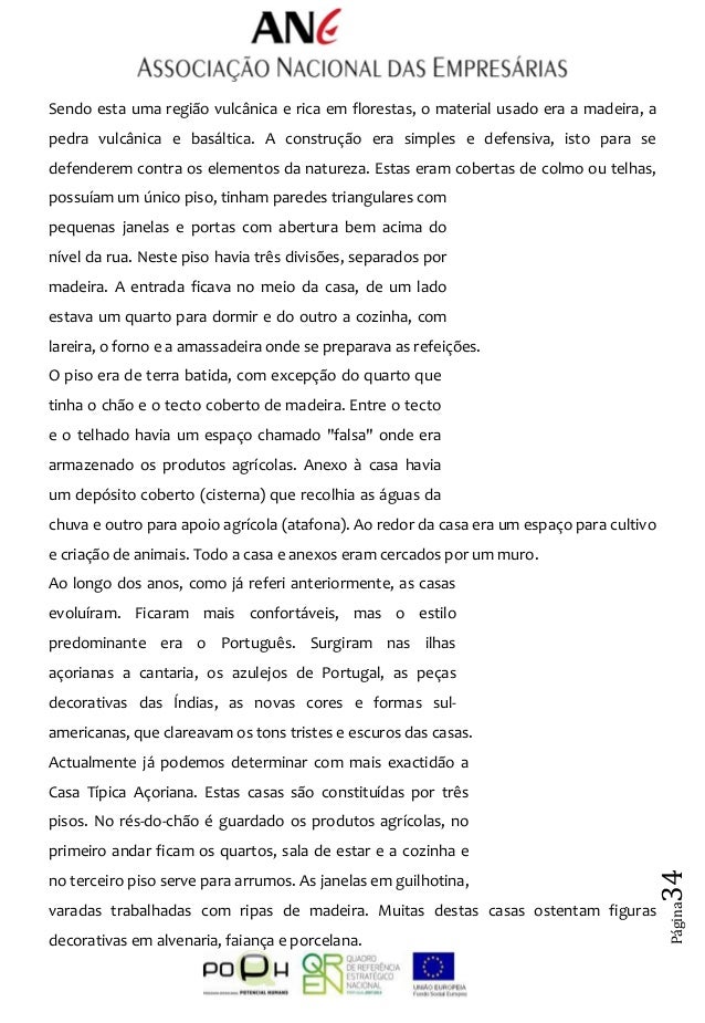 34. 34. Página34 Sendo esta uma região vulcânica e rica em florestas, o material usado era a madeira, a pedra vulcânica e basáltica. A construção era simples e defensiva, isto para se defenderem contra os elementos da natureza. Estas eram cobertas de colmo ou telhas, possuíam um único piso, tinham paredes triangulares com pequenas janelas e portas com abertura bem acima do nível da rua. Neste piso havia três divisões, separados por madeira. A entrada ficava no meio da casa, de um lado estava um quarto para dormir e do outro a cozinha, com lareira, o forno e a amassadeira onde se preparava as refeições. O piso era de terra batida, com excepção do quarto que tinha o chão e o tecto coberto de madeira. Entre o tecto e o telhado havia um espaço chamado "falsa" onde era armazenado os produtos agrícolas. Anexo à casa havia um depósito coberto (cisterna) que recolhia as águas da chuva e outro para apoio agrícola (atafona). Ao redor da casa era um espaço para cultivo e criação de animais. Todo a casa e anexos eram cercados por um muro. Ao longo dos anos, como já referi anteriormente, as casas evoluíram. Ficaram mais confortáveis, mas o estilo predominante era o Português. Surgiram nas ilhas açorianas a cantaria, os azulejos de Portugal, as peças decorativas das Índias, as novas cores e formas sul- americanas, que clareavam os tons tristes e escuros das casas. Actualmente já podemos determinar com mais exactidão a Casa Típica Açoriana. Estas casas são constituídas por três pisos. No rés-do-chão é guardado os produtos agrícolas, no primeiro andar ficam os quartos, sala de estar e a cozinha e no terceiro piso serve para arrumos. As janelas em guilhotina, varadas trabalhadas com ripas de madeira. Muitas destas casas ostentam figuras decorativas em alvenaria, faiança e porcelana.