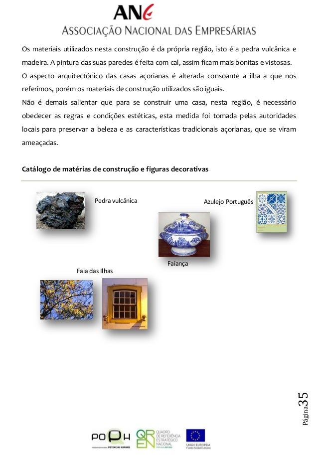 35. 35. Página35 Os materiais utilizados nesta construção é da própria região, isto é a pedra vulcânica e madeira. A pintura das suas paredes é feita com cal, assim ficam mais bonitas e vistosas. O aspecto arquitectónico das casas açorianas é alterada consoante a ilha a que nos referimos, porém os materiais de construção utilizados são iguais. Não é demais salientar que para se construir uma casa, nesta região, é necessário obedecer as regras e condições estéticas, esta medida foi tomada pelas autoridades locais para preservar a beleza e as características tradicionais açorianas, que se viram ameaçadas. Catálogo de matérias de construção e figuras decorativas Pedra vulcânica Faia das Ilhas Faiança Azulejo Português