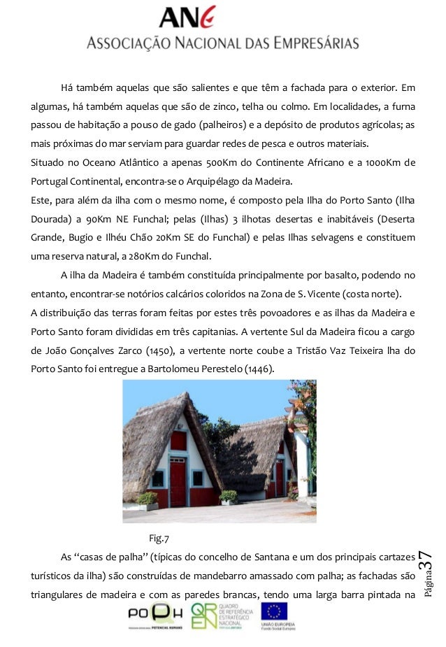 37. 37. Página37 Há também aquelas que são salientes e que têm a fachada para o exterior. Em algumas, há também aquelas que são de zinco, telha ou colmo. Em localidades, a furna passou de habitação a pouso de gado (palheiros) e a depósito de produtos agrícolas; as mais próximas do mar serviam para guardar redes de pesca e outros materiais. Situado no Oceano Atlântico a apenas 500Km do Continente Africano e a 1000Km de Portugal Continental, encontra-se o Arquipélago da Madeira. Este, para além da ilha com o mesmo nome, é composto pela Ilha do Porto Santo (Ilha Dourada) a 90Km NE Funchal; pelas (Ilhas) 3 ilhotas desertas e inabitáveis (Deserta Grande, Bugio e Ilhéu Chão 20Km SE do Funchal) e pelas Ilhas selvagens e constituem uma reserva natural, a 280Km do Funchal. A ilha da Madeira é também constituída principalmente por basalto, podendo no entanto, encontrar-se notórios calcários coloridos na Zona de S. Vicente (costa norte). A distribuição das terras foram feitas por estes três povoadores e as ilhas da Madeira e Porto Santo foram divididas em três capitanias. A vertente Sul da Madeira ficou a cargo de João Gonçalves Zarco (1450), a vertente norte coube a Tristão Vaz Teixeira lha do Porto Santo foi entregue a Bartolomeu Perestelo (1446). Fig.7 As “casas de palha” (típicas do concelho de Santana e um dos principais cartazes turísticos da ilha) são construídas de mandebarro amassado com palha; as fachadas são triangulares de madeira e com as paredes brancas, tendo uma larga barra pintada na