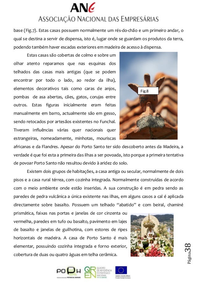38. 38. Página38 base (Fig.7). Estas casas possuem normalmente um rés-do-chão e um primeiro andar, o qual se destina a servir de dispensa, isto é, lugar onde se guardam os produtos da terra, podendo também haver escadas exteriores em madeira de acesso à dispensa. Estas casas são cobertas de colmo e sobre um olhar atento reparamos que nas esquinas dos telhados das casas mais antigas (que se podem encontrar por todo o lado, ao redor da ilha), elementos decorativos tais como caras de anjos, pombas de asa abertas, cães, gatos, corujas entre outros. Estas figuras inicialmente eram feitas manualmente em barro, actualmente são em gesso, sendo retocados por artesãos existentes no Funchal. Tiveram influências várias quer nacionais quer estrangeiras, nomeadamente, minhotas, mouriscas africanas e da Flandres. Apesar do Porto Santo ter sido descoberto antes da Madeira, a verdade é que foi esta a primeira das ilhas a ser povoada, isto porque a primeira tentativa de povoar Porto Santo não resultou devido à aridez do solo. Existem dois grupos de habitações, a casa antiga ou secular, normalmente de dois pisos e a casa rural térrea, com cozinha integrada. Normalmente construídas de acordo com o meio ambiente onde estão inseridas. A sua construção é em pedra sendo as paredes de pedra vulcânica a única existente nas ilhas, em alguns casos a cal é aplicada directamente sobre basalto. Possuem um telhado “abatido” e com beiral, chaminé prismática, faixas nas portas e janelas de cor cinzenta ou vermelha, paredes em tufo ou basalto, pavimento em lajes de basalto e janelas de guilhotina, com estores de ripes horizontais de madeira. A casa de Porto Santo é mais elementar, possuindo cozinha integrada e forno exterior, cobertura de duas ou quatro águas em telha cerâmica. Fig.8