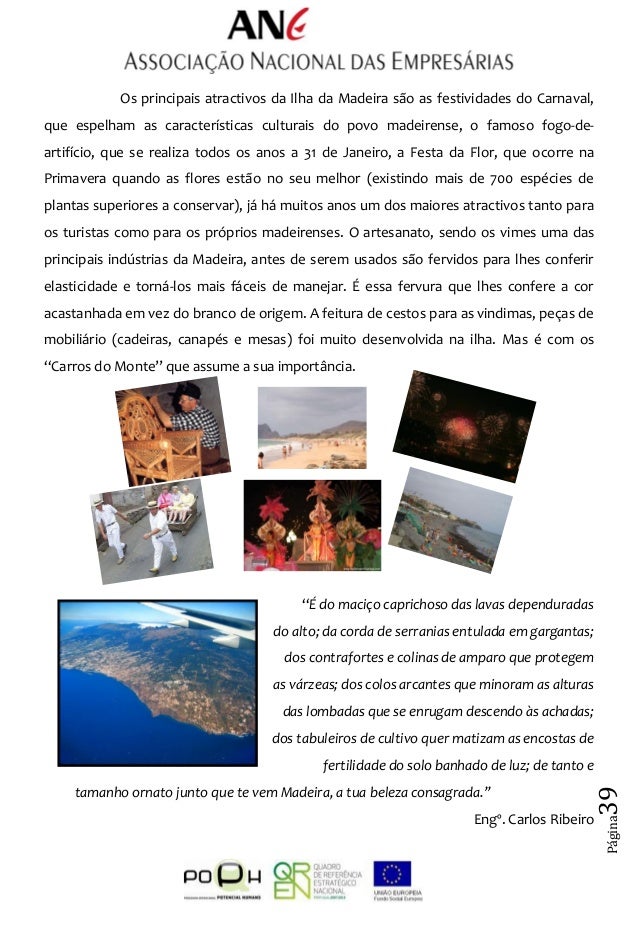 39. 39. Página39 Os principais atractivos da Ilha da Madeira são as festividades do Carnaval, que espelham as características culturais do povo madeirense, o famoso fogo-de- artifício, que se realiza todos os anos a 31 de Janeiro, a Festa da Flor, que ocorre na Primavera quando as flores estão no seu melhor (existindo mais de 700 espécies de plantas superiores a conservar), já há muitos anos um dos maiores atractivos tanto para os turistas como para os próprios madeirenses. O artesanato, sendo os vimes uma das principais indústrias da Madeira, antes de serem usados são fervidos para lhes conferir elasticidade e torná-los mais fáceis de manejar. É essa fervura que lhes confere a cor acastanhada em vez do branco de origem. A feitura de cestos para as vindimas, peças de mobiliário (cadeiras, canapés e mesas) foi muito desenvolvida na ilha. Mas é com os “Carros do Monte” que assume a sua importância. “É do maciço caprichoso das lavas dependuradas do alto; da corda de serranias entulada em gargantas; dos contrafortes e colinas de amparo que protegem as várzeas; dos colos arcantes que minoram as alturas das lombadas que se enrugam descendo às achadas; dos tabuleiros de cultivo quer matizam as encostas de fertilidade do solo banhado de luz; de tanto e tamanho ornato junto que te vem Madeira, a tua beleza consagrada.” Engº. Carlos Ribeiro