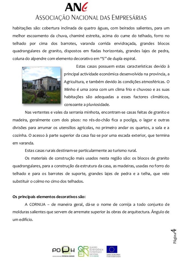 4. 4. Página4 habitações são: cobertura inclinada de quatro águas, com beirados salientes, para um melhor escoamento da chuva, chaminé estreita, acima do cume do telhado, forro no telhado por cima dos barrotes, varanda corrida envidraçada, grandes blocos quadrangulares de granito, dispostos em fiadas horizontais, grandes lajes de pedra, coluna do alpendre com elemento decorativo em “S” de dupla espiral. Estas casas possuem estas características devido à principal actividade económica desenvolvida na província, a Agricultura, e também devido às condições atmosféricas. O Minho é uma zona com um clima frio e chuvoso e as suas habitações são adequadas a esses factores climáticos, consoante a pluviosidade. Nas vertentes e vales da serrania minhota, encontram-se casas feitas de granito e madeira, geralmente com dois pisos: no rés-do-chão fica a pocilga, o lagar e outras divisões para arrumar os utensílios agrícolas, no primeiro andar os quartos, a sala e a cozinha. O acesso à parte superior da casa faz-se por uma escada exterior, que termina em varanda. Estas casas rurais destinam-se particularmente ao turismo rural. Os materiais de construção mais usados nesta região são: os blocos de granito quadrangulares, para a construção da estrutura da casa, as madeiras, usadas no forro do telhado e para os barrotes de suporte, grandes lajes de pedra e a telha, que veio substituir o colmo no cimo dos telhados. Os principais elementos decorativos são: A CORNIJA – de maneira geral, dá-se o nome de cornija a todo conjunto de molduras salientes que servem de arremate superior às obras de arquitectura. Ângulo de um edifício.