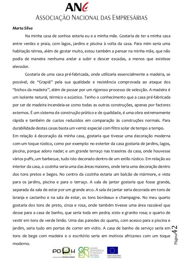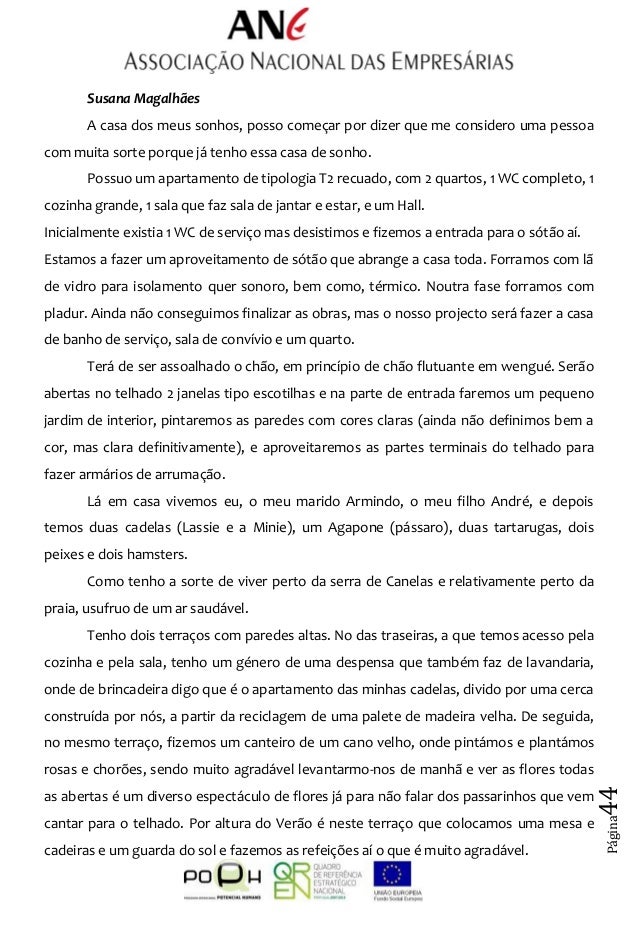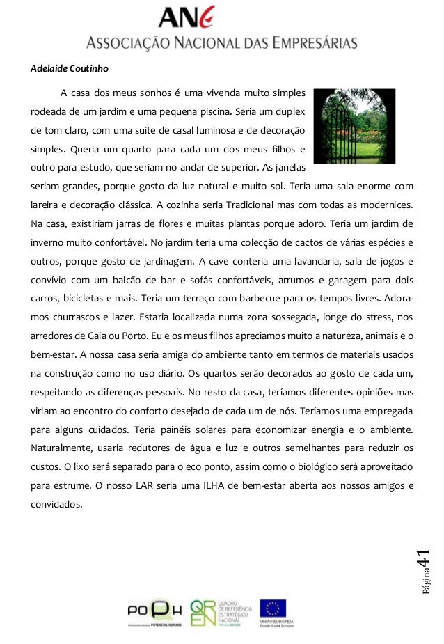 41. 41. Página41 Adelaide Coutinho A casa dos meus sonhos é uma vivenda muito simples rodeada de um jardim e uma pequena piscina. Seria um duplex de tom claro, com uma suite de casal luminosa e de decoração simples. Queria um quarto para cada um dos meus filhos e outro para estudo, que seriam no andar de superior. As janelas seriam grandes, porque gosto da luz natural e muito sol. Teria uma sala enorme com lareira e decoração clássica. A cozinha seria Tradicional mas com todas as modernices. Na casa, existiriam jarras de flores e muitas plantas porque adoro. Teria um jardim de inverno muito confortável. No jardim teria uma colecção de cactos de várias espécies e outros, porque gosto de jardinagem. A cave conteria uma lavandaria, sala de jogos e convívio com um balcão de bar e sofás confortáveis, arrumos e garagem para dois carros, bicicletas e mais. Teria um terraço com barbecue para os tempos livres. Adora- mos churrascos e lazer. Estaria localizada numa zona sossegada, longe do stress, nos arredores de Gaia ou Porto. Eu e os meus filhos apreciamos muito a natureza, animais e o bem-estar. A nossa casa seria amiga do ambiente tanto em termos de materiais usados na construção como no uso diário. Os quartos serão decorados ao gosto de cada um, respeitando as diferenças pessoais. No resto da casa, teríamos diferentes opiniões mas viriam ao encontro do conforto desejado de cada um de nós. Teríamos uma empregada para alguns cuidados. Teria painéis solares para economizar energia e o ambiente. Naturalmente, usaria redutores de água e luz e outros semelhantes para reduzir os custos. O lixo será separado para o eco ponto, assim como o biológico será aproveitado para estrume. O nosso LAR seria uma ILHA de bem-estar aberta aos nossos amigos e convidados.
