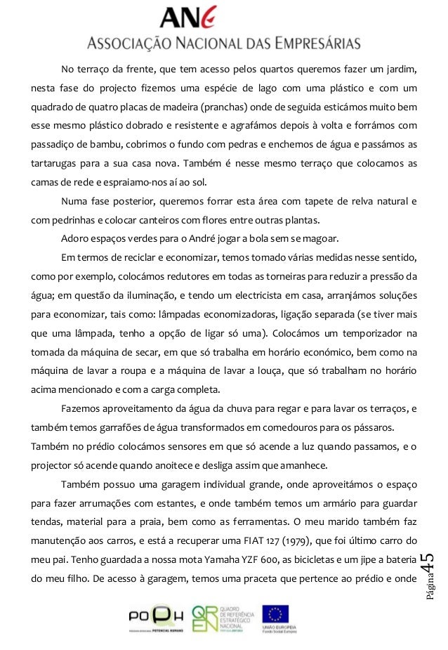 45. 45. Página45 No terraço da frente, que tem acesso pelos quartos queremos fazer um jardim, nesta fase do projecto fizemos uma espécie de lago com uma plástico e com um quadrado de quatro placas de madeira (pranchas) onde de seguida esticámos muito bem esse mesmo plástico dobrado e resistente e agrafámos depois à volta e forrámos com passadiço de bambu, cobrimos o fundo com pedras e enchemos de água e passámos as tartarugas para a sua casa nova. Também é nesse mesmo terraço que colocamos as camas de rede e espraiamo-nos aí ao sol. Numa fase posterior, queremos forrar esta área com tapete de relva natural e com pedrinhas e colocar canteiros com flores entre outras plantas. Adoro espaços verdes para o André jogar a bola sem se magoar. Em termos de reciclar e economizar, temos tomado várias medidas nesse sentido, como por exemplo, colocámos redutores em todas as torneiras para reduzir a pressão da água; em questão da iluminação, e tendo um electricista em casa, arranjámos soluções para economizar, tais como: lâmpadas economizadoras, ligação separada (se tiver mais que uma lâmpada, tenho a opção de ligar só uma). Colocámos um temporizador na tomada da máquina de secar, em que só trabalha em horário económico, bem como na máquina de lavar a roupa e a máquina de lavar a louça, que só trabalham no horário acima mencionado e com a carga completa. Fazemos aproveitamento da água da chuva para regar e para lavar os terraços, e também temos garrafões de água transformados em comedouros para os pássaros. Também no prédio colocámos sensores em que só acende a luz quando passamos, e o projector só acende quando anoitece e desliga assim que amanhece. Também possuo uma garagem individual grande, onde aproveitámos o espaço para fazer arrumações com estantes, e onde também temos um armário para guardar tendas, material para a praia, bem como as ferramentas. O meu marido também faz manutenção aos carros, e está a recuperar uma FIAT 127 (1979), que foi último carro do meu pai. Tenho guardada a nossa mota Yamaha YZF 600, as bicicletas e um jipe a bateria do meu filho. De acesso à garagem, temos uma praceta que pertence ao prédio e onde