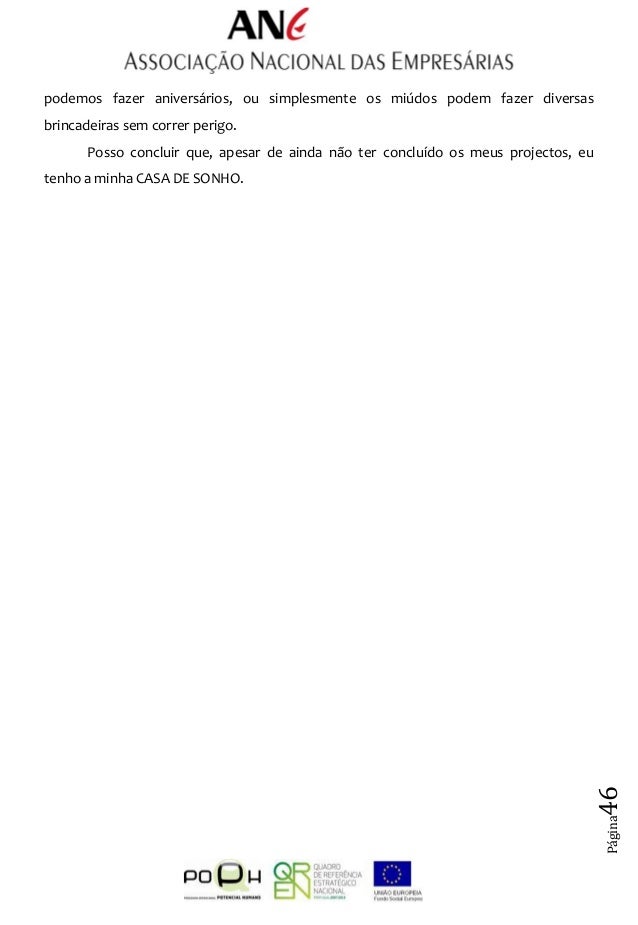 46. 46. Página46 podemos fazer aniversários, ou simplesmente os miúdos podem fazer diversas brincadeiras sem correr perigo. Posso concluir que, apesar de ainda não ter concluído os meus projectos, eu tenho a minha CASA DE SONHO.