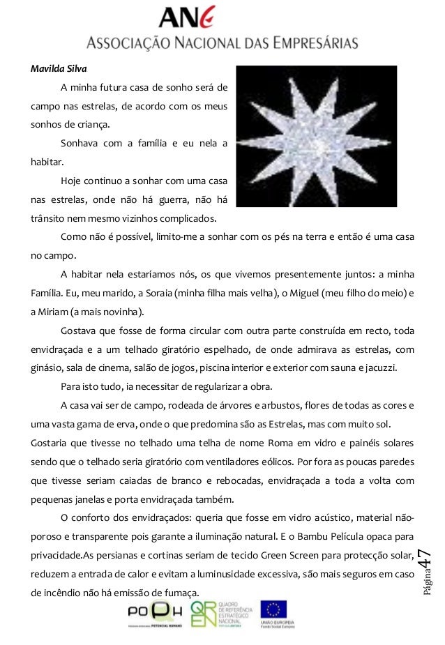 47. 47. Página47 Mavilda Silva A minha futura casa de sonho será de campo nas estrelas, de acordo com os meus sonhos de criança. Sonhava com a família e eu nela a habitar. Hoje continuo a sonhar com uma casa nas estrelas, onde não há guerra, não há trânsito nem mesmo vizinhos complicados. Como não é possível, limito-me a sonhar com os pés na terra e então é uma casa no campo. A habitar nela estaríamos nós, os que vivemos presentemente juntos: a minha Família. Eu, meu marido, a Soraia (minha filha mais velha), o Miguel (meu filho do meio) e a Miriam (a mais novinha). Gostava que fosse de forma circular com outra parte construída em recto, toda envidraçada e a um telhado giratório espelhado, de onde admirava as estrelas, com ginásio, sala de cinema, salão de jogos, piscina interior e exterior com sauna e jacuzzi. Para isto tudo, ia necessitar de regularizar a obra. A casa vai ser de campo, rodeada de árvores e arbustos, flores de todas as cores e uma vasta gama de erva, onde o que predomina são as Estrelas, mas com muito sol. Gostaria que tivesse no telhado uma telha de nome Roma em vidro e painéis solares sendo que o telhado seria giratório com ventiladores eólicos. Por fora as poucas paredes que tivesse seriam caiadas de branco e rebocadas, envidraçada a toda a volta com pequenas janelas e porta envidraçada também. O conforto dos envidraçados: queria que fosse em vidro acústico, material não- poroso e transparente pois garante a iluminação natural. E o Bambu Película opaca para privacidade.As persianas e cortinas seriam de tecido Green Screen para protecção solar, reduzem a entrada de calor e evitam a luminusidade excessiva, são mais seguros em caso de incêndio não há emissão de fumaça.