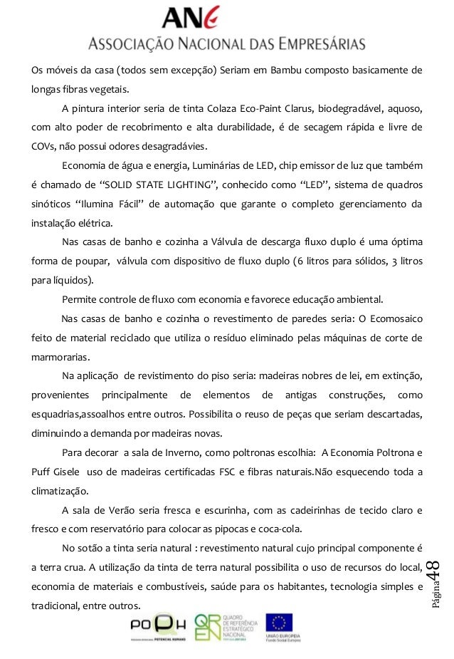 48. 48. Página48 Os móveis da casa (todos sem excepção) Seriam em Bambu composto basicamente de longas fibras vegetais. A pintura interior seria de tinta Colaza Eco-Paint Clarus, biodegradável, aquoso, com alto poder de recobrimento e alta durabilidade, é de secagem rápida e livre de COVs, não possui odores desagradávies. Economia de água e energia, Luminárias de LED, chip emissor de luz que também é chamado de “SOLID STATE LIGHTING”, conhecido como “LED”, sistema de quadros sinóticos “Ilumina Fácil” de automação que garante o completo gerenciamento da instalação elétrica. Nas casas de banho e cozinha a Válvula de descarga fluxo duplo é uma óptima forma de poupar, válvula com dispositivo de fluxo duplo (6 litros para sólidos, 3 litros para líquidos). Permite controle de fluxo com economia e favorece educação ambiental. Nas casas de banho e cozinha o revestimento de paredes seria: O Ecomosaico feito de material reciclado que utiliza o resíduo eliminado pelas máquinas de corte de marmorarias. Na aplicação de revistimento do piso seria: madeiras nobres de lei, em extinção, provenientes principalmente de elementos de antigas construções, como esquadrias,assoalhos entre outros. Possibilita o reuso de peças que seriam descartadas, diminuindo a demanda por madeiras novas. Para decorar a sala de Inverno, como poltronas escolhia: A Economia Poltrona e Puff Gisele uso de madeiras certificadas FSC e fibras naturais.Não esquecendo toda a climatização. A sala de Verão seria fresca e escurinha, com as cadeirinhas de tecido claro e fresco e com reservatório para colocar as pipocas e coca-cola. No sotão a tinta seria natural : revestimento natural cujo principal componente é a terra crua. A utilização da tinta de terra natural possibilita o uso de recursos do local, economia de materiais e combustíveis, saúde para os habitantes, tecnologia simples e tradicional, entre outros.