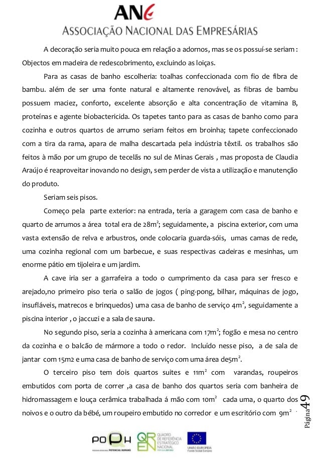 49. 49. Página49 A decoração seria muito pouca em relação a adornos, mas se os possuí-se seriam : Objectos em madeira de redescobrimento, excluindo as loiças. Para as casas de banho escolheria: toalhas confeccionada com fio de fibra de bambu. além de ser uma fonte natural e altamente renovável, as fibras de bambu possuem maciez, conforto, excelente absorção e alta concentração de vitamina B, proteínas e agente biobactericida. Os tapetes tanto para as casas de banho como para cozinha e outros quartos de arrumo seriam feitos em broinha; tapete confeccionado com a tira da rama, apara de malha descartada pela indústria têxtil. os trabalhos são feitos à mão por um grupo de tecelãs no sul de Minas Gerais , mas proposta de Claudia Araújo é reaproveitar inovando no design, sem perder de vista a utilização e manutenção do produto. Seriam seis pisos. Começo pela parte exterior: na entrada, teria a garagem com casa de banho e quarto de arrumos a área total era de 28m2 ; seguidamente, a piscina exterior, com uma vasta extensão de relva e arbustros, onde colocaria guarda-sóis, umas camas de rede, uma cozinha regional com um barbecue, e suas respectivas cadeiras e mesinhas, um enorme pátio em tijoleira e um jardim. A cave iria ser a garrafeira a todo o cumprimento da casa para ser fresco e arejado,no primeiro piso teria o salão de jogos ( ping-pong, bilhar, máquinas de jogo, insufláveis, matrecos e brinquedos) uma casa de banho de serviço 4m2 , seguidamente a piscina interior , o jaccuzi e a sala de sauna. No segundo piso, seria a cozinha à americana com 17m2 ; fogão e mesa no centro da cozinha e o balcão de mármore a todo o redor. Incluído nesse piso, a de sala de jantar com 15m2 e uma casa de banho de serviço com uma área de5m2 . O terceiro piso tem dois quartos suites e 11m2 com varandas, roupeiros embutidos com porta de correr ,a casa de banho dos quartos seria com banheira de hidromassagem e louça cerâmica trabalhada á mão com 10m2 cada uma, o quarto dos noivos e o outro da bébé, um roupeiro embutido no corredor e um escritório com 9m2 .