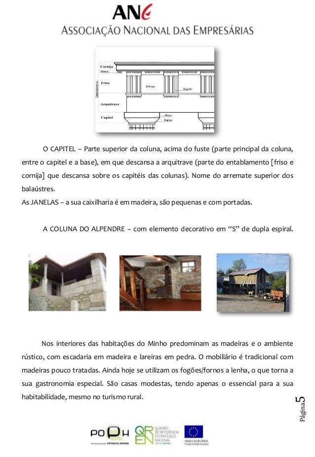5. 5. Página5 O CAPITEL – Parte superior da coluna, acima do fuste (parte principal da coluna, entre o capitel e a base), em que descansa a arquitrave (parte do entablamento [friso e cornija] que descansa sobre os capitéis das colunas). Nome do arremate superior dos balaústres. As JANELAS – a sua caixilharia é em madeira, são pequenas e com portadas. A COLUNA DO ALPENDRE – com elemento decorativo em “S” de dupla espiral. Nos interiores das habitações do Minho predominam as madeiras e o ambiente rústico, com escadaria em madeira e lareiras em pedra. O mobiliário é tradicional com madeiras pouco tratadas. Ainda hoje se utilizam os fogões/fornos a lenha, o que torna a sua gastronomia especial. São casas modestas, tendo apenas o essencial para a sua habitabilidade, mesmo no turismo rural.