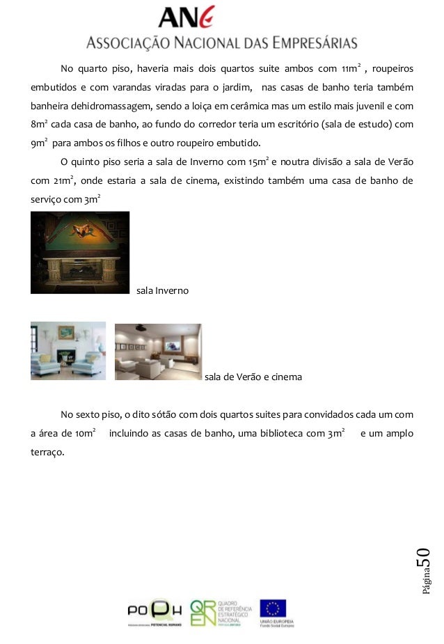 50. 50. Página50 No quarto piso, haveria mais dois quartos suite ambos com 11m2 , roupeiros embutidos e com varandas viradas para o jardim, nas casas de banho teria também banheira dehidromassagem, sendo a loiça em cerâmica mas um estilo mais juvenil e com 8m2 cada casa de banho, ao fundo do corredor teria um escritório (sala de estudo) com 9m2 para ambos os filhos e outro roupeiro embutido. O quinto piso seria a sala de Inverno com 15m2 e noutra divisão a sala de Verão com 21m2 , onde estaria a sala de cinema, existindo também uma casa de banho de serviço com 3m2 sala Inverno sala de Verão e cinema No sexto piso, o dito sótão com dois quartos suites para convidados cada um com a área de 10m2 incluindo as casas de banho, uma biblioteca com 3m2 e um amplo terraço.