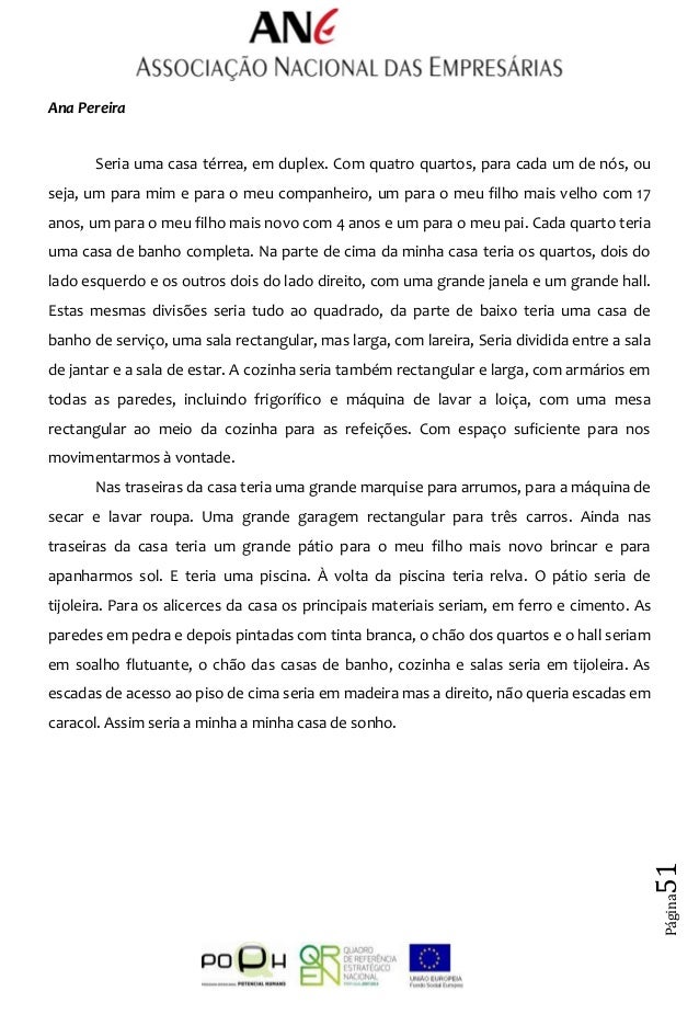 51. 51. Página51 Ana Pereira Seria uma casa térrea, em duplex. Com quatro quartos, para cada um de nós, ou seja, um para mim e para o meu companheiro, um para o meu filho mais velho com 17 anos, um para o meu filho mais novo com 4 anos e um para o meu pai. Cada quarto teria uma casa de banho completa. Na parte de cima da minha casa teria os quartos, dois do lado esquerdo e os outros dois do lado direito, com uma grande janela e um grande hall. Estas mesmas divisões seria tudo ao quadrado, da parte de baixo teria uma casa de banho de serviço, uma sala rectangular, mas larga, com lareira, Seria dividida entre a sala de jantar e a sala de estar. A cozinha seria também rectangular e larga, com armários em todas as paredes, incluindo frigorífico e máquina de lavar a loiça, com uma mesa rectangular ao meio da cozinha para as refeições. Com espaço suficiente para nos movimentarmos à vontade. Nas traseiras da casa teria uma grande marquise para arrumos, para a máquina de secar e lavar roupa. Uma grande garagem rectangular para três carros. Ainda nas traseiras da casa teria um grande pátio para o meu filho mais novo brincar e para apanharmos sol. E teria uma piscina. À volta da piscina teria relva. O pátio seria de tijoleira. Para os alicerces da casa os principais materiais seriam, em ferro e cimento. As paredes em pedra e depois pintadas com tinta branca, o chão dos quartos e o hall seriam em soalho flutuante, o chão das casas de banho, cozinha e salas seria em tijoleira. As escadas de acesso ao piso de cima seria em madeira mas a direito, não queria escadas em caracol. Assim seria a minha a minha casa de sonho.