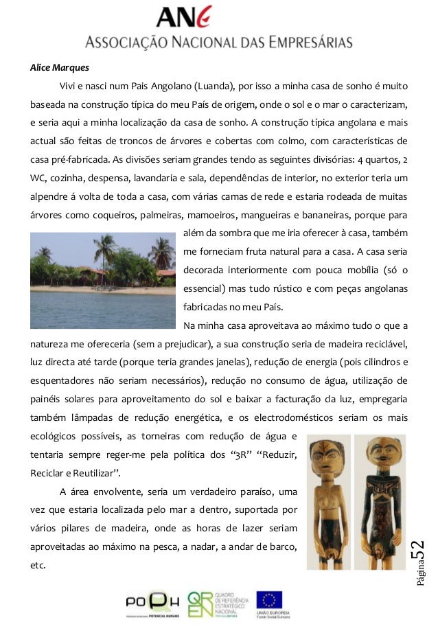 52. 52. Página52 Alice Marques Vivi e nasci num Pais Angolano (Luanda), por isso a minha casa de sonho é muito baseada na construção típica do meu País de origem, onde o sol e o mar o caracterizam, e seria aqui a minha localização da casa de sonho. A construção típica angolana e mais actual são feitas de troncos de árvores e cobertas com colmo, com características de casa pré-fabricada. As divisões seriam grandes tendo as seguintes divisórias: 4 quartos, 2 WC, cozinha, despensa, lavandaria e sala, dependências de interior, no exterior teria um alpendre á volta de toda a casa, com várias camas de rede e estaria rodeada de muitas árvores como coqueiros, palmeiras, mamoeiros, mangueiras e bananeiras, porque para além da sombra que me iria oferecer à casa, também me forneciam fruta natural para a casa. A casa seria decorada interiormente com pouca mobília (só o essencial) mas tudo rústico e com peças angolanas fabricadas no meu País. Na minha casa aproveitava ao máximo tudo o que a natureza me ofereceria (sem a prejudicar), a sua construção seria de madeira reciclável, luz directa até tarde (porque teria grandes janelas), redução de energia (pois cilindros e esquentadores não seriam necessários), redução no consumo de água, utilização de painéis solares para aproveitamento do sol e baixar a facturação da luz, empregaria também lâmpadas de redução energética, e os electrodomésticos seriam os mais ecológicos possíveis, as torneiras com redução de água e tentaria sempre reger-me pela política dos “3R” “Reduzir, Reciclar e Reutilizar”. A área envolvente, seria um verdadeiro paraíso, uma vez que estaria localizada pelo mar a dentro, suportada por vários pilares de madeira, onde as horas de lazer seriam aproveitadas ao máximo na pesca, a nadar, a andar de barco, etc.