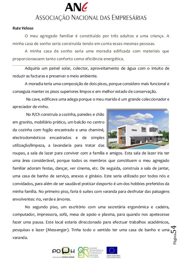 54. 54. Página54 Rute Veloso O meu agregado familiar é constituído por três adultos e uma criança. A minha casa de sonho seria construída tendo em conta essas mesmas pessoas. A minha casa de sonho seria uma moradia edificada com materiais que proporcionassem tanto conforto como eficiência energética. Adquiria um painel solar, colector, aproveitamento de água com o intuito de reduzir as facturas e preservar o meio ambiente. A moradia teria uma composição de dois pisos, porque considero mais funcional e conseguia manter os pisos superiores limpos e em melhor estado de conservação. Na cave, edificava uma adega porque o meu marido é um grande coleccionador e apreciador de vinho. No R/Ch construía a cozinha, paredes e chão em granito, mobiliário prático, um balcão no centro da cozinha com fogão encastrado e uma chaminé, electrodomésticos encastrados e de simples utilização/limpeza, a lavandaria para tratar das roupas, a sala de lazer para conviver com a família e amigos. Esta sala de lazer iria ter uma área considerável, porque todos os membros que constituem o meu agregado familiar adoram festas, dançar, ver cinema, etc. De seguida, construía a sala de jantar, uma casa de banho de serviço, anexos e ginásio. Este seria utilizado por todos nós e convidados, para além de ser saudável praticar desporto é um dos hobbies preferidos da minha família. No primeiro piso, faria 6 suites com varanda para desfrutar das paisagens envolventes: rio, verde e árvores. No segundo piso, um escritório com uma secretária ergonómica e cadeira, computador, impressora, sofá, mesa de apoio e plasma, para quando nos apetecesse fazer uma pausa. Este local estaria direccionado para efectuar trabalhos académicos, pesquisas e lazer (Messenger). Tinha todo o sentido ter uma casa de banho e uma varanda.