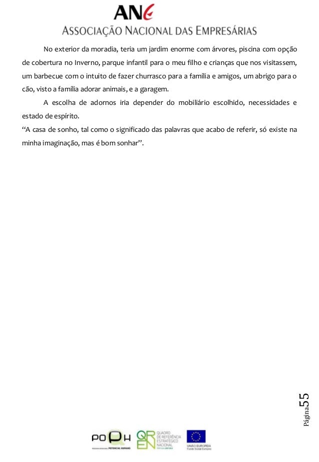 55. 55. Página55 No exterior da moradia, teria um jardim enorme com árvores, piscina com opção de cobertura no Inverno, parque infantil para o meu filho e crianças que nos visitassem, um barbecue com o intuito de fazer churrasco para a família e amigos, um abrigo para o cão, visto a família adorar animais, e a garagem. A escolha de adornos iria depender do mobiliário escolhido, necessidades e estado de espírito. “A casa de sonho, tal como o significado das palavras que acabo de referir, só existe na minha imaginação, mas é bom sonhar”.