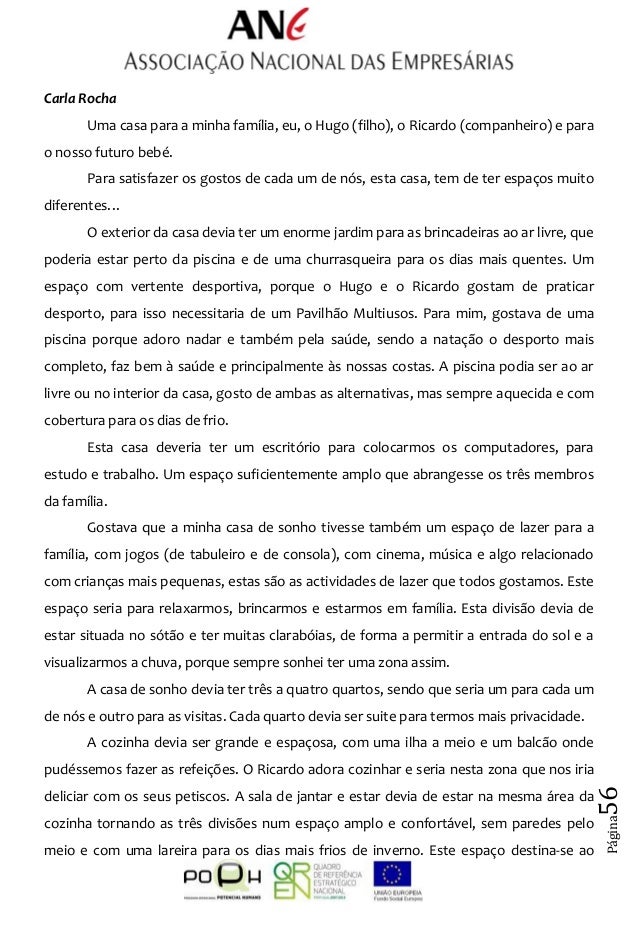 56. 56. Página56 Carla Rocha Uma casa para a minha família, eu, o Hugo (filho), o Ricardo (companheiro) e para o nosso futuro bebé. Para satisfazer os gostos de cada um de nós, esta casa, tem de ter espaços muito diferentes… O exterior da casa devia ter um enorme jardim para as brincadeiras ao ar livre, que poderia estar perto da piscina e de uma churrasqueira para os dias mais quentes. Um espaço com vertente desportiva, porque o Hugo e o Ricardo gostam de praticar desporto, para isso necessitaria de um Pavilhão Multiusos. Para mim, gostava de uma piscina porque adoro nadar e também pela saúde, sendo a natação o desporto mais completo, faz bem à saúde e principalmente às nossas costas. A piscina podia ser ao ar livre ou no interior da casa, gosto de ambas as alternativas, mas sempre aquecida e com cobertura para os dias de frio. Esta casa deveria ter um escritório para colocarmos os computadores, para estudo e trabalho. Um espaço suficientemente amplo que abrangesse os três membros da família. Gostava que a minha casa de sonho tivesse também um espaço de lazer para a família, com jogos (de tabuleiro e de consola), com cinema, música e algo relacionado com crianças mais pequenas, estas são as actividades de lazer que todos gostamos. Este espaço seria para relaxarmos, brincarmos e estarmos em família. Esta divisão devia de estar situada no sótão e ter muitas clarabóias, de forma a permitir a entrada do sol e a visualizarmos a chuva, porque sempre sonhei ter uma zona assim. A casa de sonho devia ter três a quatro quartos, sendo que seria um para cada um de nós e outro para as visitas. Cada quarto devia ser suite para termos mais privacidade. A cozinha devia ser grande e espaçosa, com uma ilha a meio e um balcão onde pudéssemos fazer as refeições. O Ricardo adora cozinhar e seria nesta zona que nos iria deliciar com os seus petiscos. A sala de jantar e estar devia de estar na mesma área da cozinha tornando as três divisões num espaço amplo e confortável, sem paredes pelo meio e com uma lareira para os dias mais frios de inverno. Este espaço destina-se ao