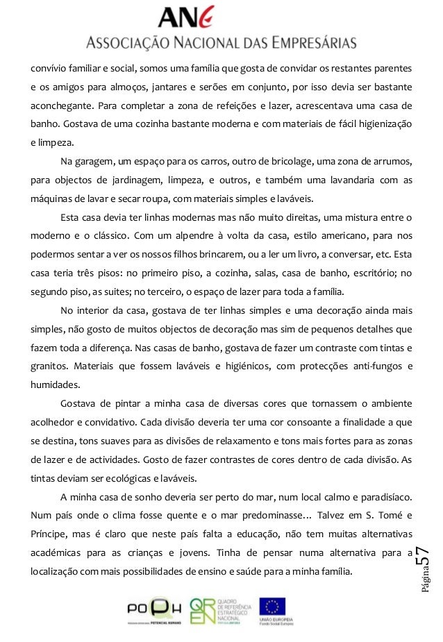 57. 57. Página57 convívio familiar e social, somos uma família que gosta de convidar os restantes parentes e os amigos para almoços, jantares e serões em conjunto, por isso devia ser bastante aconchegante. Para completar a zona de refeições e lazer, acrescentava uma casa de banho. Gostava de uma cozinha bastante moderna e com materiais de fácil higienização e limpeza. Na garagem, um espaço para os carros, outro de bricolage, uma zona de arrumos, para objectos de jardinagem, limpeza, e outros, e também uma lavandaria com as máquinas de lavar e secar roupa, com materiais simples e laváveis. Esta casa devia ter linhas modernas mas não muito direitas, uma mistura entre o moderno e o clássico. Com um alpendre à volta da casa, estilo americano, para nos podermos sentar a ver os nossos filhos brincarem, ou a ler um livro, a conversar, etc. Esta casa teria três pisos: no primeiro piso, a cozinha, salas, casa de banho, escritório; no segundo piso, as suites; no terceiro, o espaço de lazer para toda a família. No interior da casa, gostava de ter linhas simples e uma decoração ainda mais simples, não gosto de muitos objectos de decoração mas sim de pequenos detalhes que fazem toda a diferença. Nas casas de banho, gostava de fazer um contraste com tintas e granitos. Materiais que fossem laváveis e higiénicos, com protecções anti-fungos e humidades. Gostava de pintar a minha casa de diversas cores que tornassem o ambiente acolhedor e convidativo. Cada divisão deveria ter uma cor consoante a finalidade a que se destina, tons suaves para as divisões de relaxamento e tons mais fortes para as zonas de lazer e de actividades. Gosto de fazer contrastes de cores dentro de cada divisão. As tintas deviam ser ecológicas e laváveis. A minha casa de sonho deveria ser perto do mar, num local calmo e paradisíaco. Num país onde o clima fosse quente e o mar predominasse… Talvez em S. Tomé e Príncipe, mas é claro que neste país falta a educação, não tem muitas alternativas académicas para as crianças e jovens. Tinha de pensar numa alternativa para a localização com mais possibilidades de ensino e saúde para a minha família.
