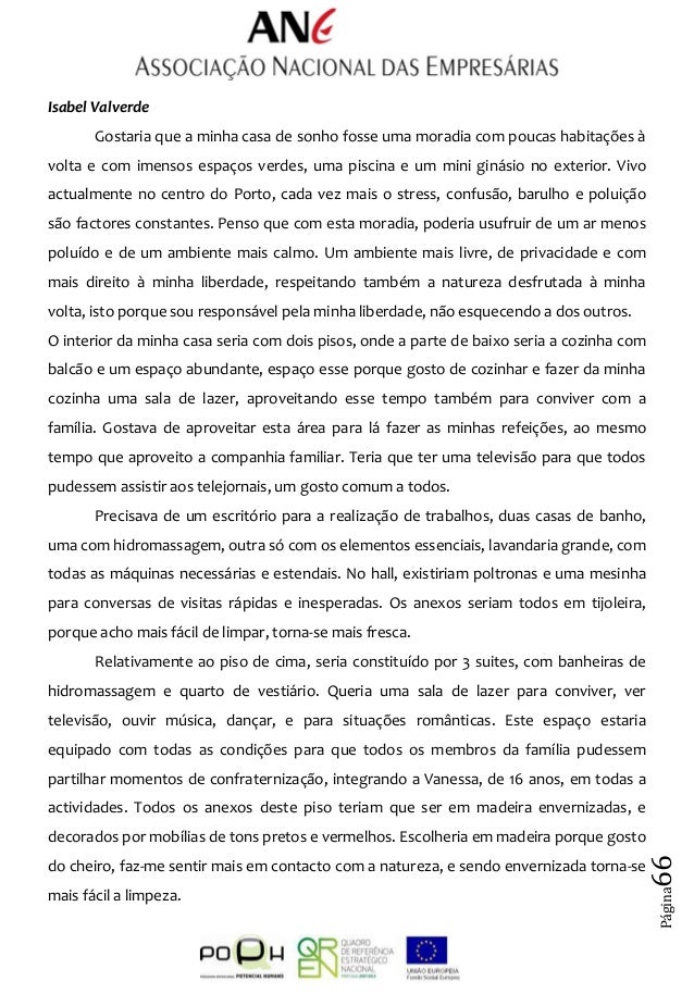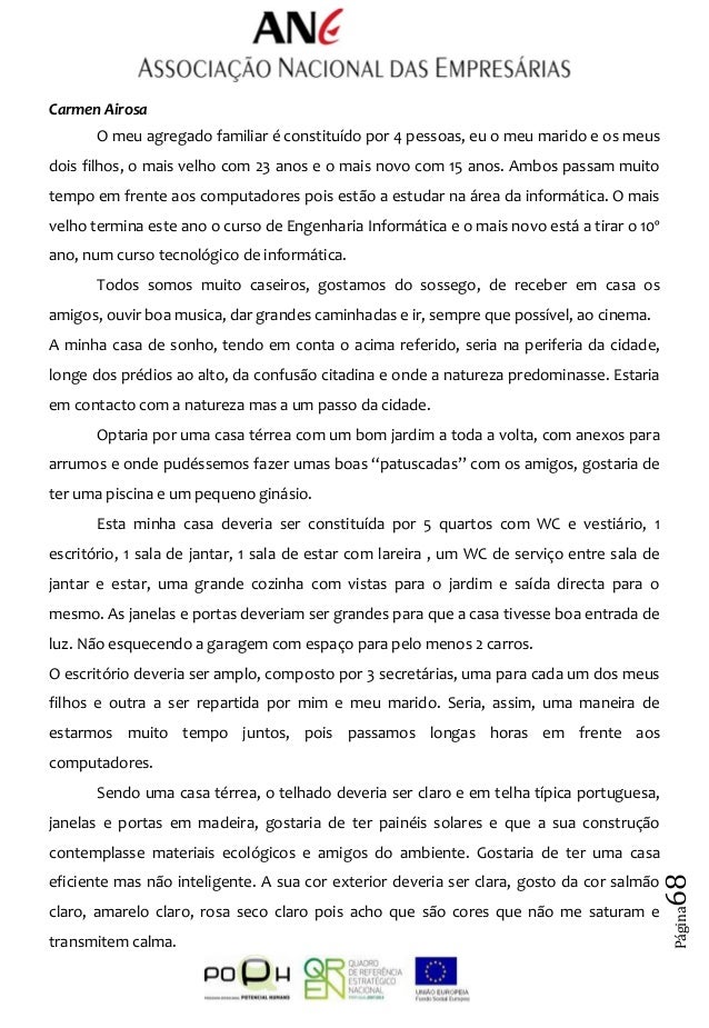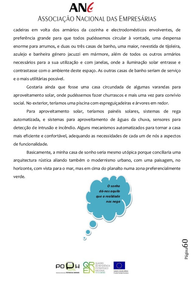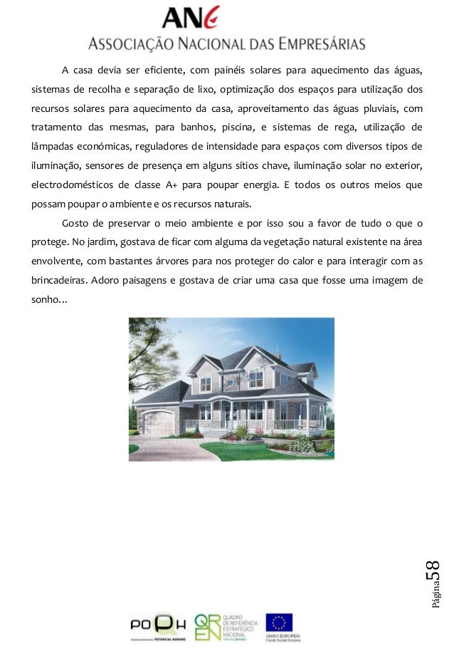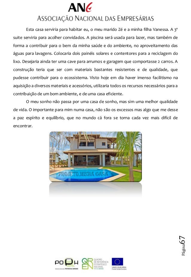 67. 67. Página67 Esta casa serviria para habitar eu, o meu marido Zé e a minha filha Vanessa. A 3ª suite serviria para acolher convidados. A piscina será usada para lazer, mas também de forma a contribuir para o bem da minha saúde e do ambiente, no aproveitamento das águas para lavagens. Colocaria dois painéis solares e contentores para a reciclagem do lixo. Desejaria ainda ter uma cave para arrumos e garagem que comportasse 2 carros. A construção teria que ser com materiais bastantes resistentes e de qualidade, que pudesse contribuir para o ecossistema. Visto hoje em dia haver imenso facilitismo na aquisição a diversos materiais e acessórios, utilizaria todos os recursos necessários para a contribuição de um bom ambiente, e de uma casa eficiente. O meu sonho não passa por uma casa de sonho, mas sim uma melhor qualidade de vida. O importante para mim numa casa, não são os excessos mas algo que me desse a paz espírito e equilíbrio, que no mundo cá fora se torna cada vez mais difícil de encontrar.