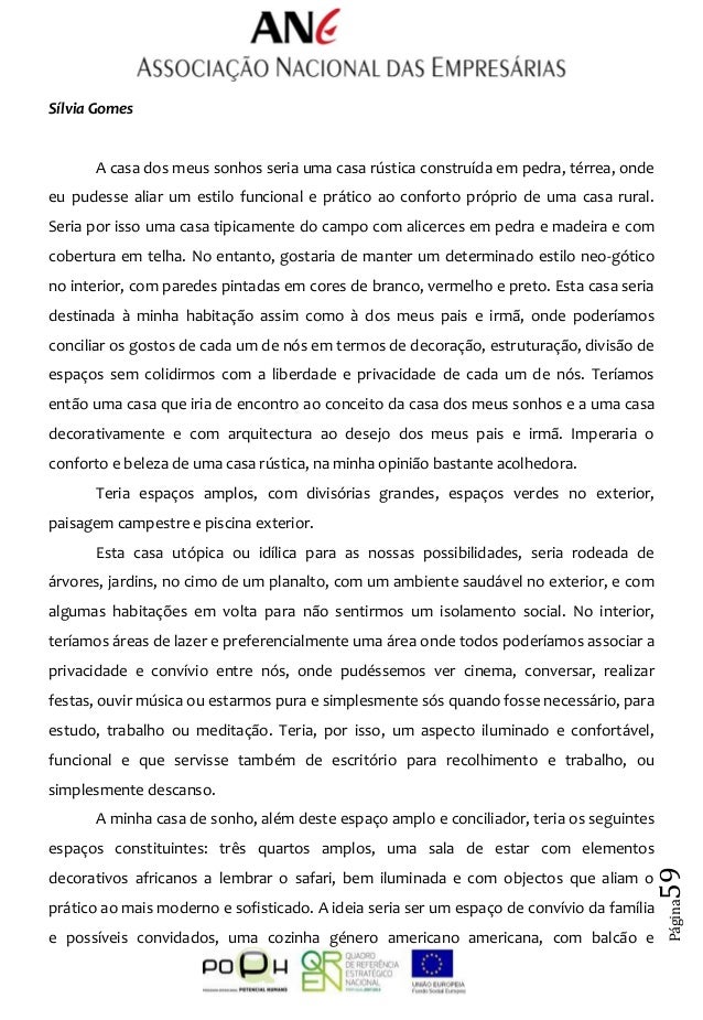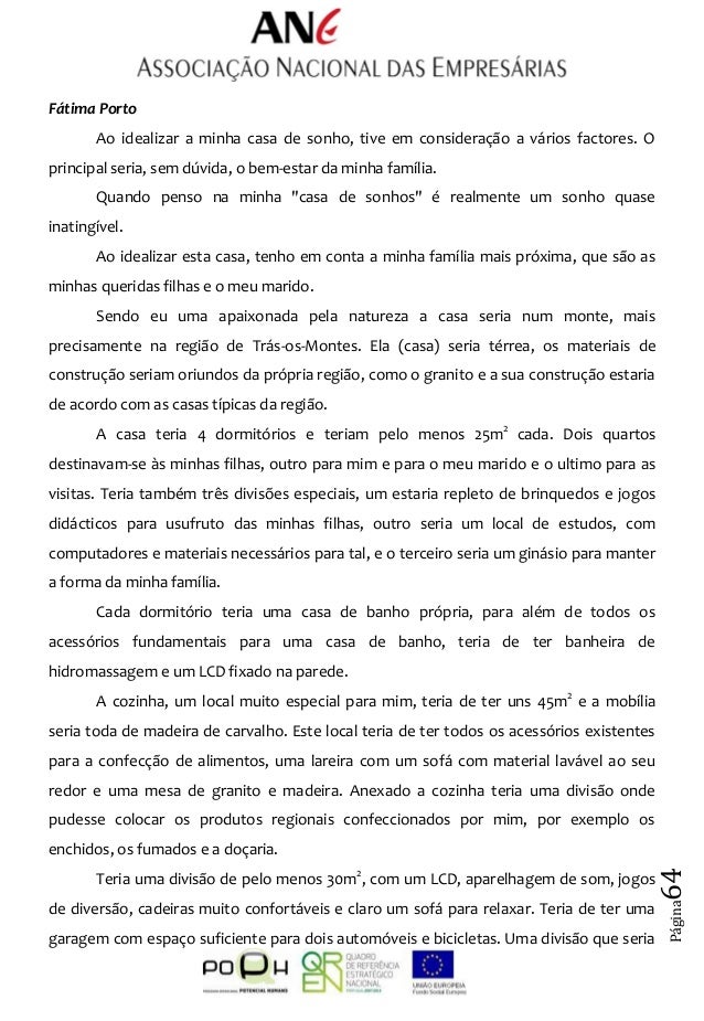 64. 64. Página64 Fátima Porto Ao idealizar a minha casa de sonho, tive em consideração a vários factores. O principal seria, sem dúvida, o bem-estar da minha família. Quando penso na minha "casa de sonhos" é realmente um sonho quase inatingível. Ao idealizar esta casa, tenho em conta a minha família mais próxima, que são as minhas queridas filhas e o meu marido. Sendo eu uma apaixonada pela natureza a casa seria num monte, mais precisamente na região de Trás-os-Montes. Ela (casa) seria térrea, os materiais de construção seriam oriundos da própria região, como o granito e a sua construção estaria de acordo com as casas típicas da região. A casa teria 4 dormitórios e teriam pelo menos 25m2 cada. Dois quartos destinavam-se às minhas filhas, outro para mim e para o meu marido e o ultimo para as visitas. Teria também três divisões especiais, um estaria repleto de brinquedos e jogos didácticos para usufruto das minhas filhas, outro seria um local de estudos, com computadores e materiais necessários para tal, e o terceiro seria um ginásio para manter a forma da minha família. Cada dormitório teria uma casa de banho própria, para além de todos os acessórios fundamentais para uma casa de banho, teria de ter banheira de hidromassagem e um LCD fixado na parede. A cozinha, um local muito especial para mim, teria de ter uns 45m2 e a mobília seria toda de madeira de carvalho. Este local teria de ter todos os acessórios existentes para a confecção de alimentos, uma lareira com um sofá com material lavável ao seu redor e uma mesa de granito e madeira. Anexado a cozinha teria uma divisão onde pudesse colocar os produtos regionais confeccionados por mim, por exemplo os enchidos, os fumados e a doçaria. Teria uma divisão de pelo menos 30m2 , com um LCD, aparelhagem de som, jogos de diversão, cadeiras muito confortáveis e claro um sofá para relaxar. Teria de ter uma garagem com espaço suficiente para dois automóveis e bicicletas. Uma divisão que seria
