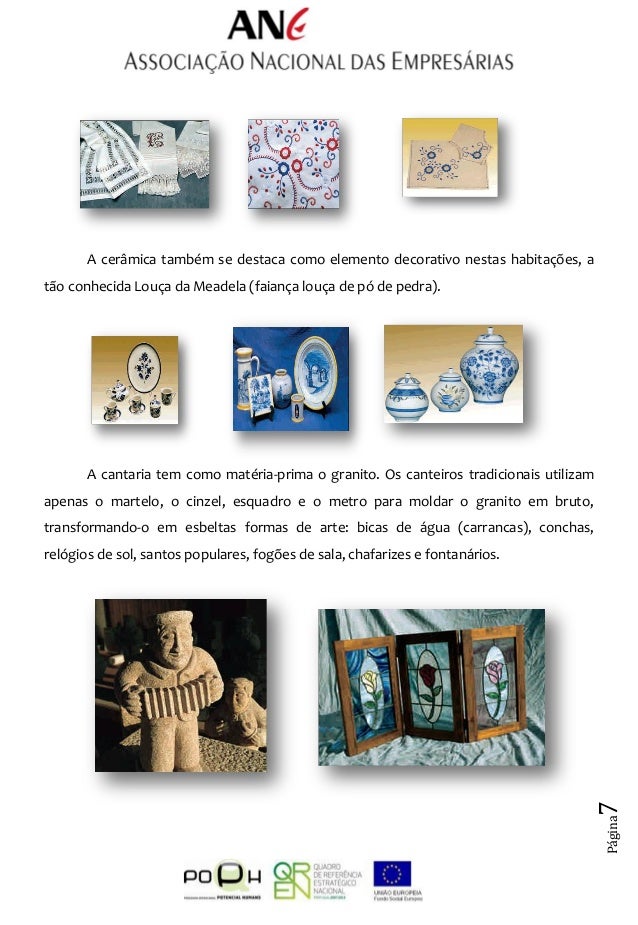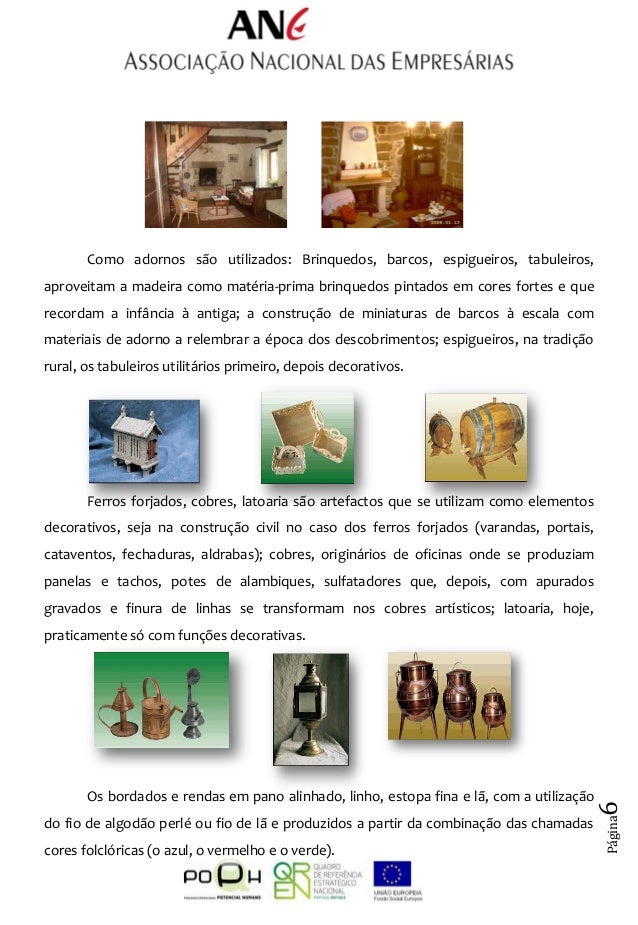 6. 6. Página6 Como adornos são utilizados: Brinquedos, barcos, espigueiros, tabuleiros, aproveitam a madeira como matéria-prima brinquedos pintados em cores fortes e que recordam a infância à antiga; a construção de miniaturas de barcos à escala com materiais de adorno a relembrar a época dos descobrimentos; espigueiros, na tradição rural, os tabuleiros utilitários primeiro, depois decorativos. Ferros forjados, cobres, latoaria são artefactos que se utilizam como elementos decorativos, seja na construção civil no caso dos ferros forjados (varandas, portais, cataventos, fechaduras, aldrabas); cobres, originários de oficinas onde se produziam panelas e tachos, potes de alambiques, sulfatadores que, depois, com apurados gravados e finura de linhas se transformam nos cobres artísticos; latoaria, hoje, praticamente só com funções decorativas. Os bordados e rendas em pano alinhado, linho, estopa fina e lã, com a utilização do fio de algodão perlé ou fio de lã e produzidos a partir da combinação das chamadas cores folclóricas (o azul, o vermelho e o verde).