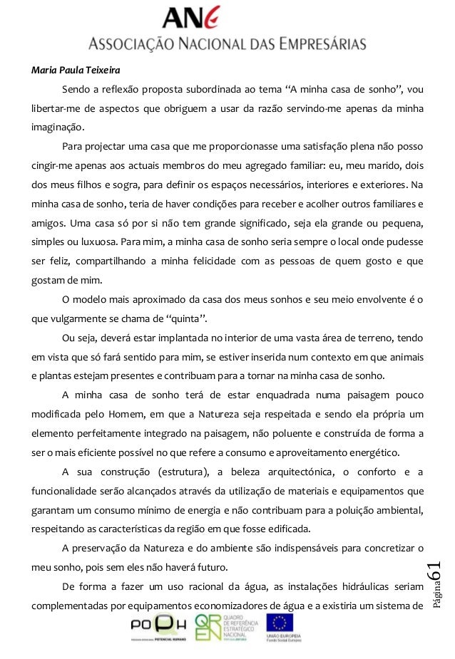 61. 61. Página61 Maria Paula Teixeira Sendo a reflexão proposta subordinada ao tema “A minha casa de sonho”, vou libertar-me de aspectos que obriguem a usar da razão servindo-me apenas da minha imaginação. Para projectar uma casa que me proporcionasse uma satisfação plena não posso cingir-me apenas aos actuais membros do meu agregado familiar: eu, meu marido, dois dos meus filhos e sogra, para definir os espaços necessários, interiores e exteriores. Na minha casa de sonho, teria de haver condições para receber e acolher outros familiares e amigos. Uma casa só por si não tem grande significado, seja ela grande ou pequena, simples ou luxuosa. Para mim, a minha casa de sonho seria sempre o local onde pudesse ser feliz, compartilhando a minha felicidade com as pessoas de quem gosto e que gostam de mim. O modelo mais aproximado da casa dos meus sonhos e seu meio envolvente é o que vulgarmente se chama de “quinta”. Ou seja, deverá estar implantada no interior de uma vasta área de terreno, tendo em vista que só fará sentido para mim, se estiver inserida num contexto em que animais e plantas estejam presentes e contribuam para a tornar na minha casa de sonho. A minha casa de sonho terá de estar enquadrada numa paisagem pouco modificada pelo Homem, em que a Natureza seja respeitada e sendo ela própria um elemento perfeitamente integrado na paisagem, não poluente e construída de forma a ser o mais eficiente possível no que refere a consumo e aproveitamento energético. A sua construção (estrutura), a beleza arquitectónica, o conforto e a funcionalidade serão alcançados através da utilização de materiais e equipamentos que garantam um consumo mínimo de energia e não contribuam para a poluição ambiental, respeitando as características da região em que fosse edificada. A preservação da Natureza e do ambiente são indispensáveis para concretizar o meu sonho, pois sem eles não haverá futuro. De forma a fazer um uso racional da água, as instalações hidráulicas seriam complementadas por equipamentos economizadores de água e a existiria um sistema de