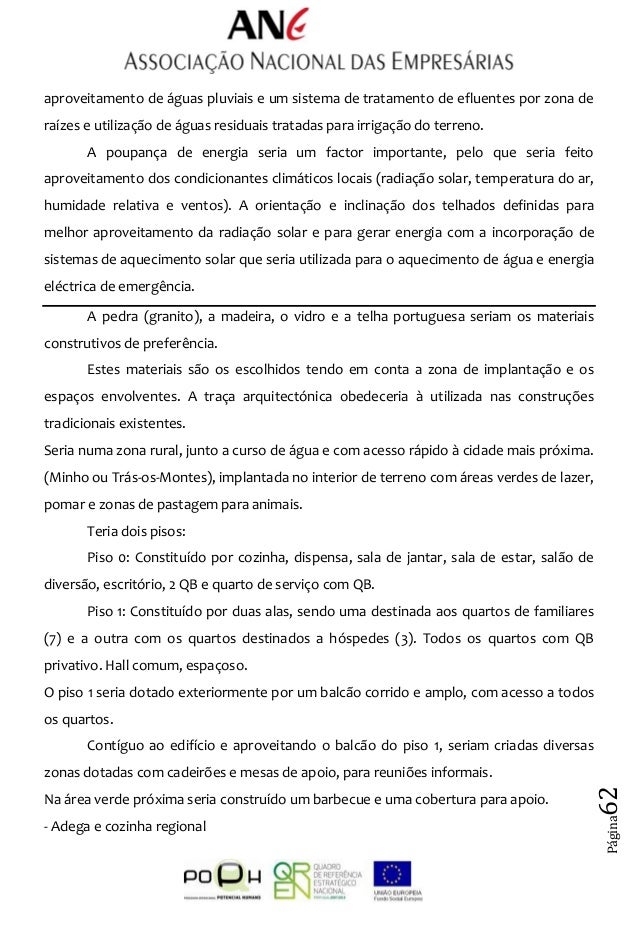 62. 62. Página62 aproveitamento de águas pluviais e um sistema de tratamento de efluentes por zona de raízes e utilização de águas residuais tratadas para irrigação do terreno. A poupança de energia seria um factor importante, pelo que seria feito aproveitamento dos condicionantes climáticos locais (radiação solar, temperatura do ar, humidade relativa e ventos). A orientação e inclinação dos telhados definidas para melhor aproveitamento da radiação solar e para gerar energia com a incorporação de sistemas de aquecimento solar que seria utilizada para o aquecimento de água e energia eléctrica de emergência. A pedra (granito), a madeira, o vidro e a telha portuguesa seriam os materiais construtivos de preferência. Estes materiais são os escolhidos tendo em conta a zona de implantação e os espaços envolventes. A traça arquitectónica obedeceria à utilizada nas construções tradicionais existentes. Seria numa zona rural, junto a curso de água e com acesso rápido à cidade mais próxima. (Minho ou Trás-os-Montes), implantada no interior de terreno com áreas verdes de lazer, pomar e zonas de pastagem para animais. Teria dois pisos: Piso 0: Constituído por cozinha, dispensa, sala de jantar, sala de estar, salão de diversão, escritório, 2 QB e quarto de serviço com QB. Piso 1: Constituído por duas alas, sendo uma destinada aos quartos de familiares (7) e a outra com os quartos destinados a hóspedes (3). Todos os quartos com QB privativo. Hall comum, espaçoso. O piso 1 seria dotado exteriormente por um balcão corrido e amplo, com acesso a todos os quartos. Contíguo ao edifício e aproveitando o balcão do piso 1, seriam criadas diversas zonas dotadas com cadeirões e mesas de apoio, para reuniões informais. Na área verde próxima seria construído um barbecue e uma cobertura para apoio. - Adega e cozinha regional