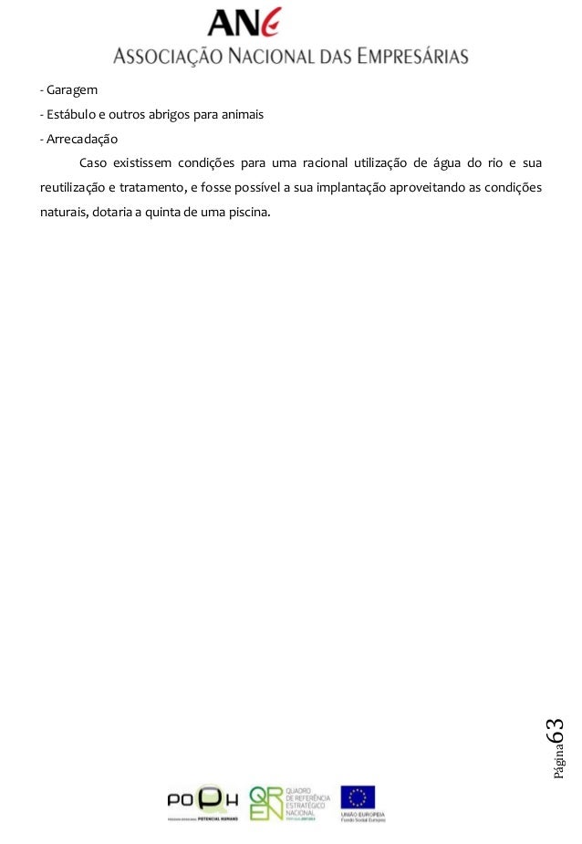 63. 63. Página63 - Garagem - Estábulo e outros abrigos para animais - Arrecadação Caso existissem condições para uma racional utilização de água do rio e sua reutilização e tratamento, e fosse possível a sua implantação aproveitando as condições naturais, dotaria a quinta de uma piscina.