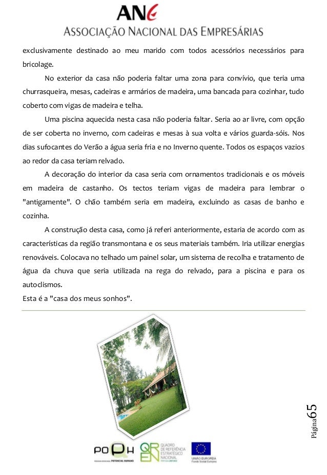 65. 65. Página65 exclusivamente destinado ao meu marido com todos acessórios necessários para bricolage. No exterior da casa não poderia faltar uma zona para convívio, que teria uma churrasqueira, mesas, cadeiras e armários de madeira, uma bancada para cozinhar, tudo coberto com vigas de madeira e telha. Uma piscina aquecida nesta casa não poderia faltar. Seria ao ar livre, com opção de ser coberta no inverno, com cadeiras e mesas à sua volta e vários guarda-sóis. Nos dias sufocantes do Verão a água seria fria e no Inverno quente. Todos os espaços vazios ao redor da casa teriam relvado. A decoração do interior da casa seria com ornamentos tradicionais e os móveis em madeira de castanho. Os tectos teriam vigas de madeira para lembrar o "antigamente". O chão também seria em madeira, excluindo as casas de banho e cozinha. A construção desta casa, como já referi anteriormente, estaria de acordo com as características da região transmontana e os seus materiais também. Iria utilizar energias renováveis. Colocava no telhado um painel solar, um sistema de recolha e tratamento de água da chuva que seria utilizada na rega do relvado, para a piscina e para os autoclismos. Esta é a "casa dos meus sonhos".