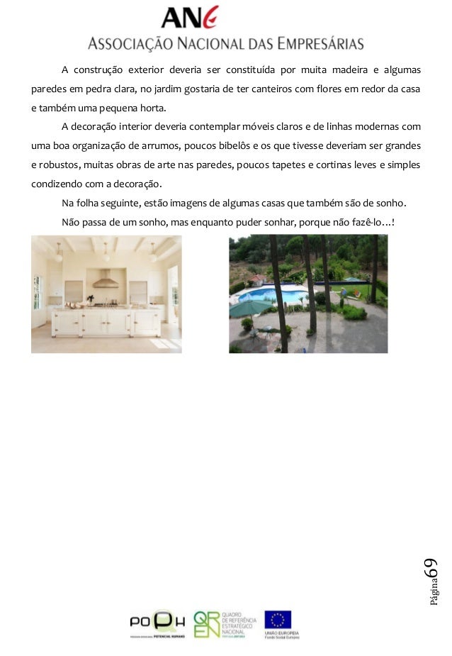 69. 69. Página69 A construção exterior deveria ser constituída por muita madeira e algumas paredes em pedra clara, no jardim gostaria de ter canteiros com flores em redor da casa e também uma pequena horta. A decoração interior deveria contemplar móveis claros e de linhas modernas com uma boa organização de arrumos, poucos bibelôs e os que tivesse deveriam ser grandes e robustos, muitas obras de arte nas paredes, poucos tapetes e cortinas leves e simples condizendo com a decoração. Na folha seguinte, estão imagens de algumas casas que também são de sonho. Não passa de um sonho, mas enquanto puder sonhar, porque não fazê-lo…!