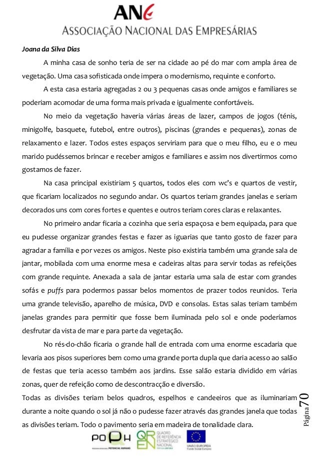 70. 70. Página70 Joana da Silva Dias A minha casa de sonho teria de ser na cidade ao pé do mar com ampla área de vegetação. Uma casa sofisticada onde impera o modernismo, requinte e conforto. A esta casa estaria agregadas 2 ou 3 pequenas casas onde amigos e familiares se poderiam acomodar de uma forma mais privada e igualmente confortáveis. No meio da vegetação haveria várias áreas de lazer, campos de jogos (ténis, minigolfe, basquete, futebol, entre outros), piscinas (grandes e pequenas), zonas de relaxamento e lazer. Todos estes espaços serviriam para que o meu filho, eu e o meu marido pudéssemos brincar e receber amigos e familiares e assim nos divertirmos como gostamos de fazer. Na casa principal existiriam 5 quartos, todos eles com wc’s e quartos de vestir, que ficariam localizados no segundo andar. Os quartos teriam grandes janelas e seriam decorados uns com cores fortes e quentes e outros teriam cores claras e relaxantes. No primeiro andar ficaria a cozinha que seria espaçosa e bem equipada, para que eu pudesse organizar grandes festas e fazer as iguarias que tanto gosto de fazer para agradar a família e por vezes os amigos. Neste piso existiria também uma grande sala de jantar, mobilada com uma enorme mesa e cadeiras altas para servir todas as refeições com grande requinte. Anexada a sala de jantar estaria uma sala de estar com grandes sofás e puffs para podermos passar belos momentos de prazer todos reunidos. Teria uma grande televisão, aparelho de música, DVD e consolas. Estas salas teriam também janelas grandes para permitir que fosse bem iluminada pelo sol e onde poderíamos desfrutar da vista de mar e para parte da vegetação. No rés-do-chão ficaria o grande hall de entrada com uma enorme escadaria que levaria aos pisos superiores bem como uma grande porta dupla que daria acesso ao salão de festas que teria acesso também aos jardins. Esse salão estaria dividido em várias zonas, quer de refeição como de descontracção e diversão. Todas as divisões teriam belos quadros, espelhos e candeeiros que as iluminariam durante a noite quando o sol já não o pudesse fazer através das grandes janela que todas as divisões teriam. Todo o pavimento seria em madeira de tonalidade clara.