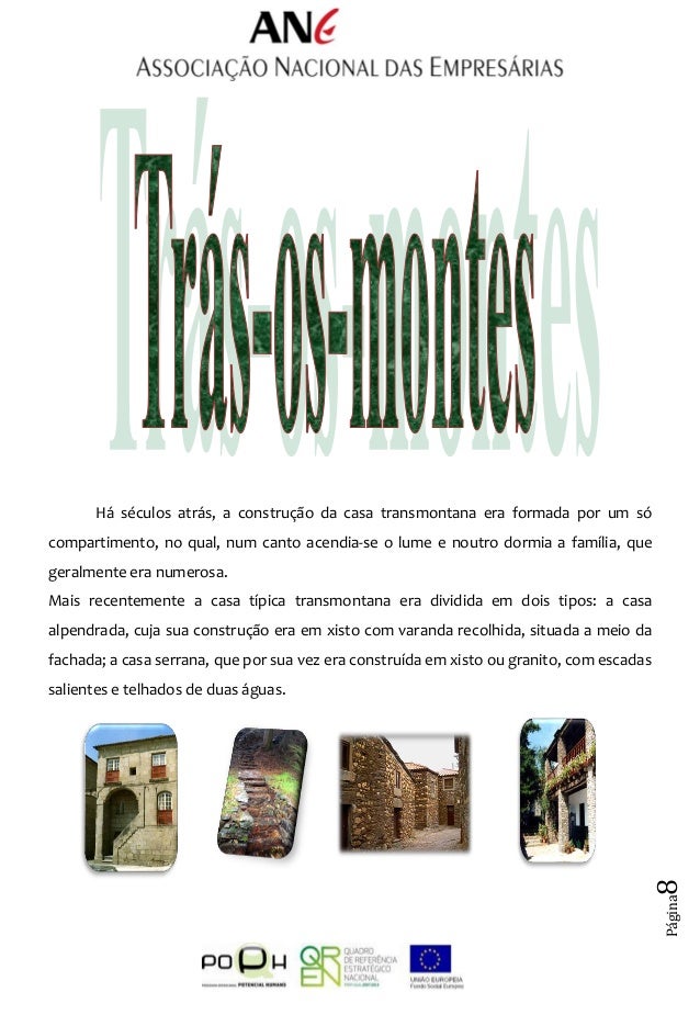 8. 8. Página8 Há séculos atrás, a construção da casa transmontana era formada por um só compartimento, no qual, num canto acendia-se o lume e noutro dormia a família, que geralmente era numerosa. Mais recentemente a casa típica transmontana era dividida em dois tipos: a casa alpendrada, cuja sua construção era em xisto com varanda recolhida, situada a meio da fachada; a casa serrana, que por sua vez era construída em xisto ou granito, com escadas salientes e telhados de duas águas.