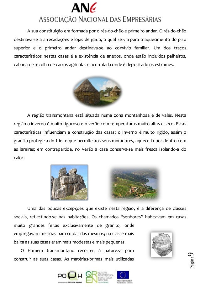 9. 9. Página9 A sua constituição era formada por o rés-do-chão e primeiro andar. O rés-do-chão destinava-se a arrecadações e lojas de gado, o qual servia para o aquecimento do piso superior e o primeiro andar destinava-se ao convívio familiar. Um dos traços característicos nestas casas é a existência de anexos, onde estão incluídos palheiros, cabana de recolha de carros agrícolas e acurralada onde é depositado os estrumes. A região transmontana está situada numa zona montanhosa e de vales. Nesta região o inverno é muito rigoroso e o verão com temperaturas muito altas e seco. Estas características influenciam a construção das casas: o Inverno é muito rígido, assim o granito protege-a do frio, o que permite aos seus moradores, aquece-la por dentro com as lareiras; em contrapartida, no Verão a casa conserva-se mais fresca isolando-a do calor. Uma das poucas excepções que existe nesta região, é a diferença de classes sociais, reflectindo-se nas habitações. Os chamados “senhores” habitavam em casas muito grandes feitas exclusivamente de granito, onde empregavam pessoas para cuidar das mesmas; na classe mais baixa as suas casas eram mais modestas e mais pequenas. O Homem transmontano recorreu à natureza para construir as suas casas. As matérias-primas mais utilizadas