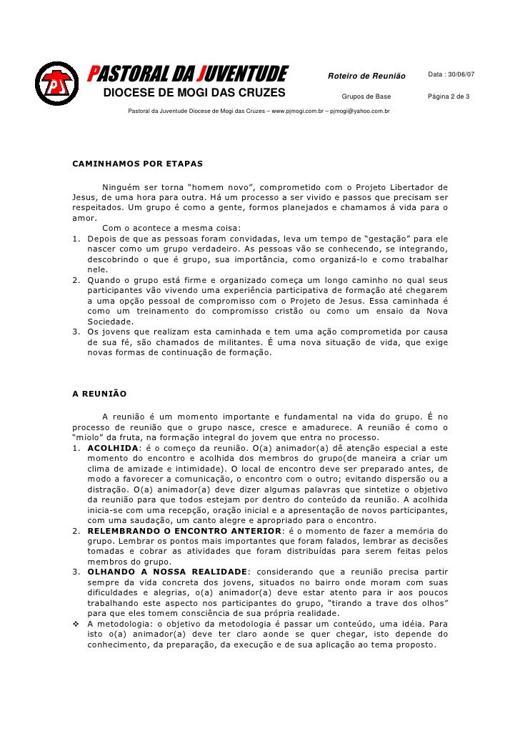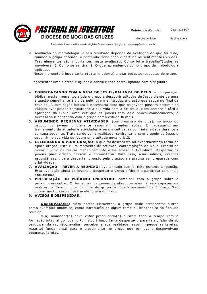 1. 1. PASTORAL DA JUVENTUDE Data : 30/06/07 Roteiro de Reunião DIOCESE DE MOGI DAS CRUZES Grupos de Base Página 1 de 3 Pastoral da Juventude Diocese de Mogi das Cruzes – www.pjmogi.com.br – pjmogi@yahoo.com.br Como iniciar um grupo de jovens Preparando o Terreno Quem se dispõe a formar e acompanhar um novo grupo de jovens precisa ter certa experiência prática e também conhecimento de algumas coisas como: ⇒ O objetivo da Pastoral da Juventude – para que criar grupos? ⇒ As etapas de caminhada do grupo; ⇒ O tipo de grupo que a PJ propõe; ⇒ E principalmente: amor e confiança na juventude; saber como convocar e reunir o pessoal e o que fazer para que o grupo se organize e se firme. NOSSO OBJETIVO A Pastoral da Juventude da Diocese tem como objetivo: “A PJ quer ser Igreja como Sacramento do Cristo. Tendo como meta levar o Jovem a se integrar na comunidade local”. (comunidade intra e extra-eclesial). A FORMAÇÃO TEM QUE SER INTEGRAL Para sermos homens livres e libertadores é preciso que a formação nos ajude a desenvolver todas as dimensões de nossa vida. Formação integral é uma formação que atenda: A dimensão afetiva, ajudando a pessoa; A dimensão social, integrando a pessoa no grupo e na comunidade; A dimensão espiritual, ajudando a crescer na fé; A dimensão política, desenvolvendo o senso crítico e ajudando a tornar-se sujeito transformador da história; A dimensão técnica, capacitando para a liderança, planejamento e organização participativos. Essa formação vai acontecer através de todas as atividades e durante o tempo de caminhada, para isso juntamos a teoria e prática, reflexão e ação, reflexão da realidade sobre a luz do Evangelho. Por isso, não aceitamos grupos que só rezam, ou que se reúnem para discutir teoria, ou só para realizar ações sem reflexão e planejamento.