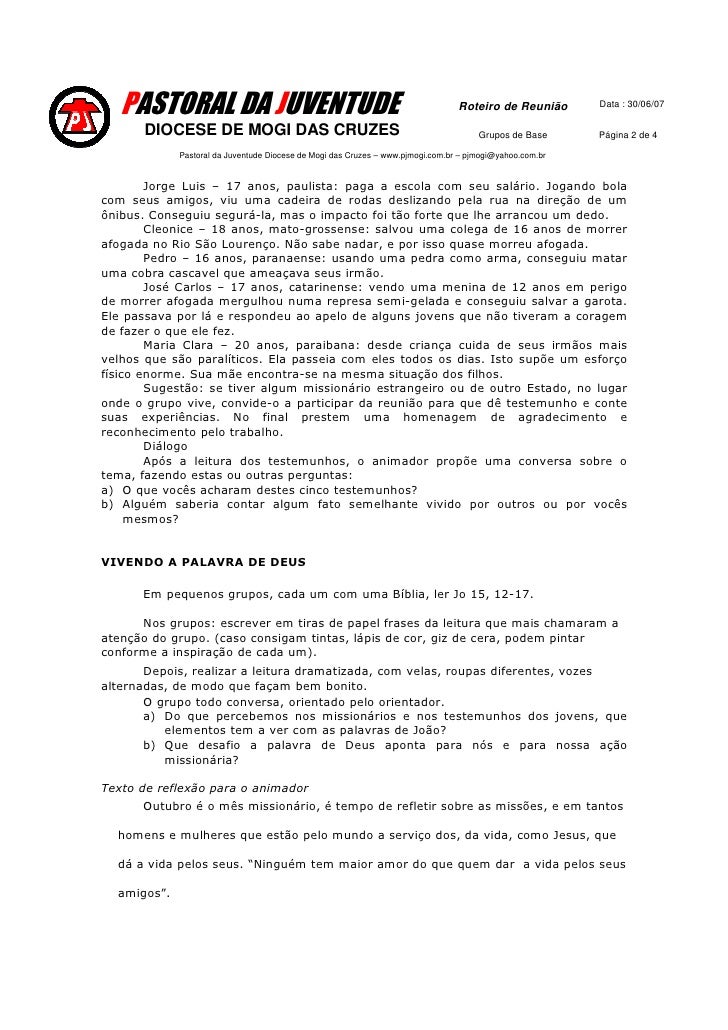 2. 2. PASTORAL DA JUVENTUDE Data : 30/06/07 Roteiro de Reunião DIOCESE DE MOGI DAS CRUZES Grupos de Base Página 2 de 4 Pastoral da Juventude Diocese de Mogi das Cruzes – www.pjmogi.com.br – pjmogi@yahoo.com.br Jorge Luis – 17 anos, paulista: paga a escola com seu salário. Jogando bola com seus amigos, viu uma cadeira de rodas deslizando pela rua na direção de um ônibus. Conseguiu segurá-la, mas o impacto foi tão forte que lhe arrancou um dedo. Cleonice – 18 anos, mato-grossense: salvou uma colega de 16 anos de morrer afogada no Rio São Lourenço. Não sabe nadar, e por isso quase morreu afogada. Pedro – 16 anos, paranaense: usando uma pedra como arma, conseguiu matar uma cobra cascavel que ameaçava seus irmão. José Carlos – 17 anos, catarinense: vendo uma menina de 12 anos em perigo de morrer afogada mergulhou numa represa semi-gelada e conseguiu salvar a garota. Ele passava por lá e respondeu ao apelo de alguns jovens que não tiveram a coragem de fazer o que ele fez. Maria Clara – 20 anos, paraibana: desde criança cuida de seus irmãos mais velhos que são paralíticos. Ela passeia com eles todos os dias. Isto supõe um esforço físico enorme. Sua mãe encontra-se na mesma situação dos filhos. Sugestão: se tiver algum missionário estrangeiro ou de outro Estado, no lugar onde o grupo vive, convide-o a participar da reunião para que dê testemunho e conte suas experiências. No final prestem uma homenagem de agradecimento e reconhecimento pelo trabalho. Diálogo Após a leitura dos testemunhos, o animador propõe uma conversa sobre o tema, fazendo estas ou outras perguntas: a) O que vocês acharam destes cinco testemunhos? b) Alguém saberia contar algum fato semelhante vivido por outros ou por vocês mesmos? VIVENDO A PALAVRA DE DEUS Em pequenos grupos, cada um com uma Bíblia, ler Jo 15, 12-17. Nos grupos: escrever em tiras de papel frases da leitura que mais chamaram a atenção do grupo. (caso consigam tintas, lápis de cor, giz de cera, podem pintar conforme a inspiração de cada um). Depois, realizar a leitura dramatizada, com velas, roupas diferentes, vozes alternadas, de modo que façam bem bonito. O grupo todo conversa, orientado pelo orientador. a) Do que percebemos nos missionários e nos testemunhos dos jovens, que elementos tem a ver com as palavras de João? b) Que desafio a palavra de Deus aponta para nós e para nossa ação missionária? Texto de reflexão para o animador Outubro é o mês missionário, é tempo de refletir sobre as missões, e em tantos homens e mulheres que estão pelo mundo a serviço dos, da vida, como Jesus, que dá a vida pelos seus. “Ninguém tem maior amor do que quem dar a vida pelos seus amigos”.