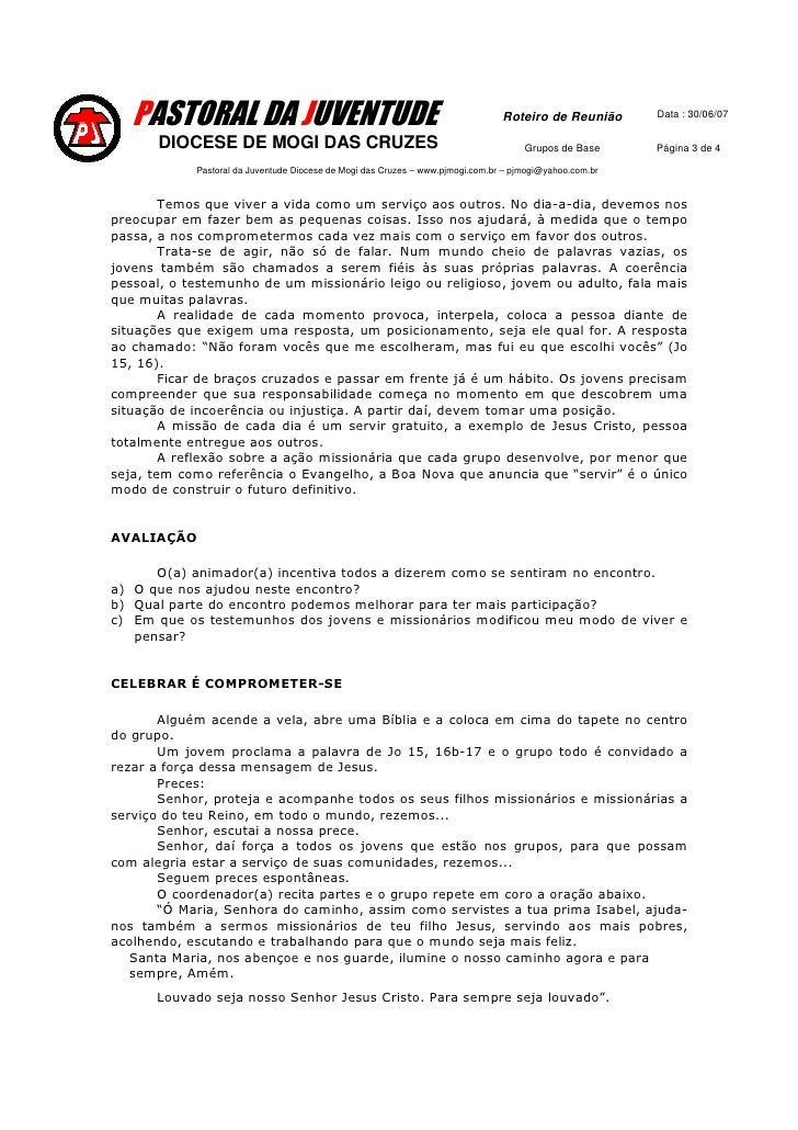 4. 4. PASTORAL DA JUVENTUDE Data : 30/06/07 Roteiro de Reunião DIOCESE DE MOGI DAS CRUZES Grupos de Base Página 4 de 4 Pastoral da Juventude Diocese de Mogi das Cruzes – www.pjmogi.com.br – pjmogi@yahoo.com.br NOSSA AÇÃO, NOSSO VIVER a) Alguns do grupo, durante a semana, reunirão para elaborar um roteiro de pesquisa (nº de presos numa cadeia pública, nº de doentes num hospital, as causas das doenças e da prisão, etc). b) Construir um mural para toda comunidade com os dados coletados na pesquisa. c) Entrevistar ou trazer alguém no encontro que trabalhe na comunidade e seja testemunho para os jovens. d) O grupo poderá planejar uma campanha de ajuda material, cesta de alimentos e visita a uma família carente. e) Os membros do grupo passarão um dia num asilo, orfanato, para ajudar na limpeza, fazer uma festa, levar um lanche, cuidar e brincar com crianças ou velhos. f) Passar o filme Missão Jovem para os jovens da comunidade e fazer um debate sobre os desafios da missão. g) Organizar uma Missão Jovem, num bairro da cidade, escola ou zona rural, com diversas atividades de lazer, oração, estudo, em ajuda aos catequistas, irmãs, outros grupos da paróquia. (o livreto Missão Jovem, um jeito jovem de evangelizar, publicado pelo CCJ, pode ajudar bastante nesse projeto). h) Escrever cartas de solidariedade aos familiares de missionários ou para grupos de jovens de outros cantos do Brasil falando da importância da nossa missão. Elaboração: Rezende Bruno Avelar