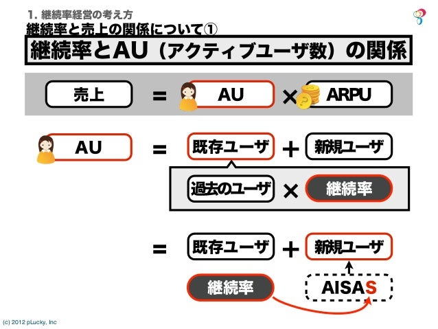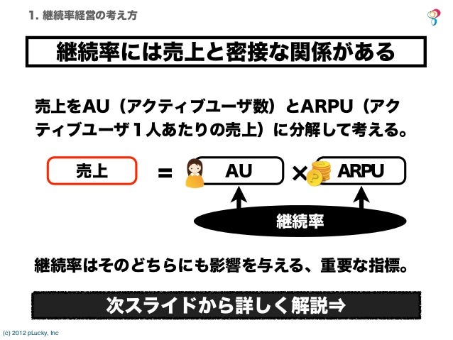 10. 10. 1. 継続率経営の考え方 継続率には売上と密接な関係がある 売上をAU(アクティブユーザ数)とARPU(アク ティブユーザ1人あたりの売上)に分解して考える。 売上 = AU ARPU 継続率 継続率はそのどちらにも影響を与える、重要な指標。 次スライドから詳しく解説⇒(c) 2012 pLucky, Inc