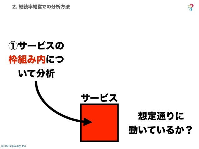 42. 42. 2. 継続率経営での分析方法 サービス データ取得 サービスの サービスの サービスのデザインを ポイントを 枠組み内 枠組み自体 枠組み外 確認 設計 を分析 を分析 を分析 適切なサービスデザインが 分析に向けた準備 行われているか? タイミングの検証 下記のタイミングに合致しているか? ・ユーザのサービス熟練度が変化したタイミング ・前回の刺激から一定期間が空いているタイミング(c) 2012 pLucky, Inc