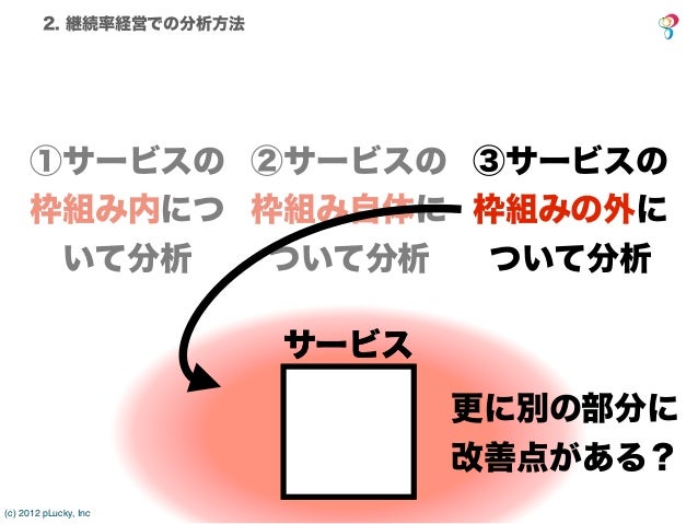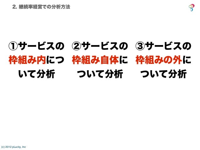 22. 22. 2. 継続率経営での分析方法 ①サービスの ②サービスの ③サービスの 枠組み内につ 枠組み自体に 枠組みの外に いて分析 ついて分析 ついて分析(c) 2012 pLucky, Inc