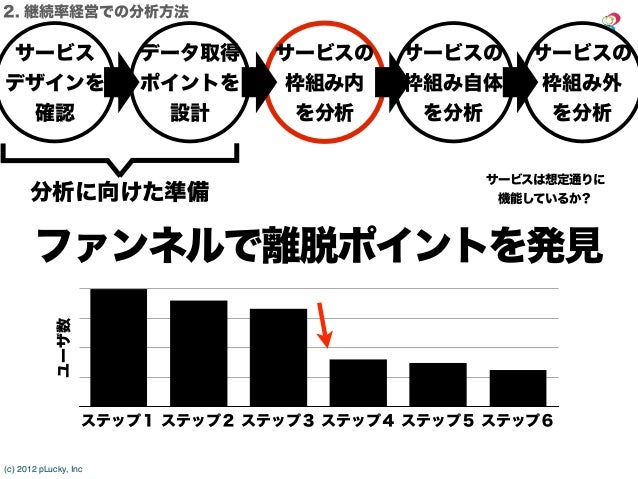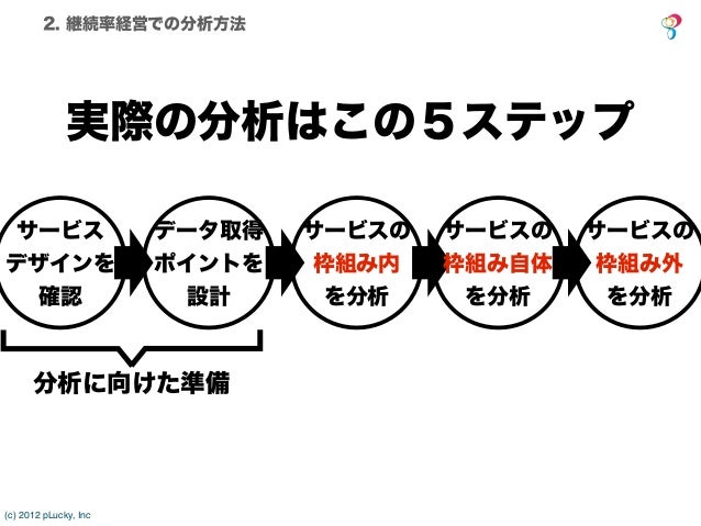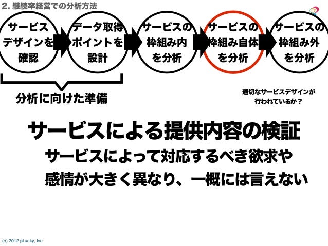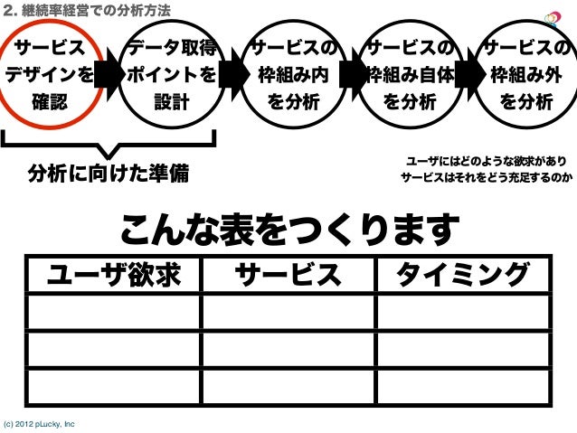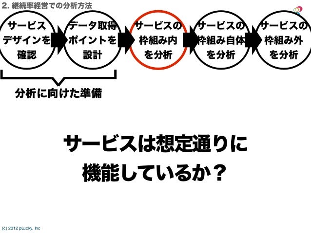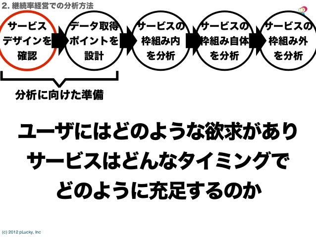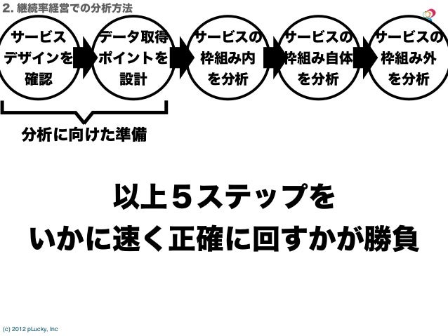46. 46. 2. 継続率経営での分析方法 サービス データ取得 サービスの サービスの サービスのデザインを ポイントを 枠組み内 枠組み自体 枠組み外 確認 設計 を分析 を分析 を分析 分析に向けた準備 以上5ステップを いかに速く正確に回すかが勝負(c) 2012 pLucky, Inc